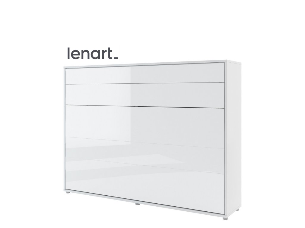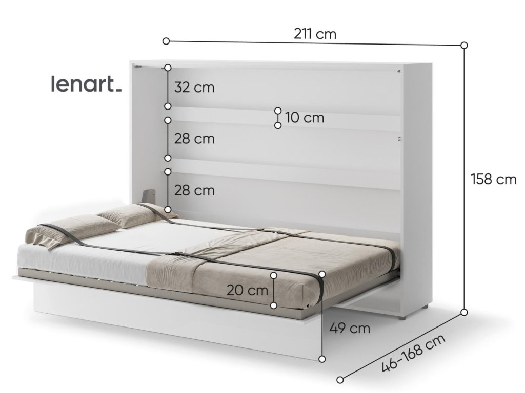 Široká výklopná postel 140 bílá lesk/bílá mat. Rozměry viz obrázek. Se sklápěcí postelí Vás už nebude trápit malý prostor Vaší domácnosti. Díky stabilní konstrukci zaručuje pohodlný odpočinek. Pneumatický mechanismus sklápění postele zajistí bezpečné otevírání a je doplněn SOFT CLOSE systémem tichého zavírání. Tento výjimečný systém Vám umožní manipulaci pouze jedním prstem. Když je postel sklopená, vypadá jako běžná skříň. Vyklopením se vytáhne celá šířka postele. Při lozložení postele má hloubku 168 cm. Uvnitř skříně jsou praktické police na knížky nebo dekorační předměty, vše máte na dosah ruky. Maximální zatížení polic je 5 kg. Rám je nutno přišroubovat ke zdi, nosnost postele je 200 kg. Rošt postele je v ceně, matrace není součástí, je potřeba ji dokoupit. Doporučujeme velikost 140 x 200 x výšku do 18 cm. Po sklopení postele vzniká prostor pod postelí o výšce 24,9 cm. Nábytek je vyroben z kvalitního lamina s ABS hranou. Lamino je odolné proti poškrábání, poškození, vlhkosti a vysokým teplotám. Postel nabízíme v několika velikostech a barevných provedeních. K posteli je možné dokoupit LED osvětlení. Dodáváme v demontovaném stavu. Můžete si prohlédnout prezentační video, klikněte ZDE.