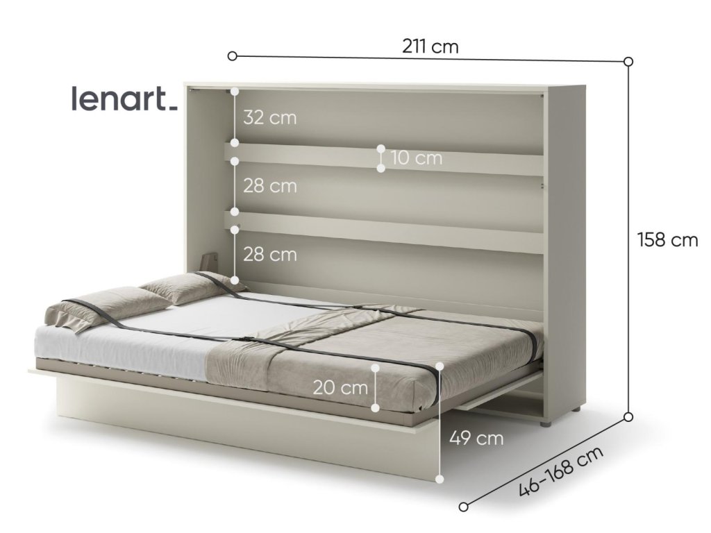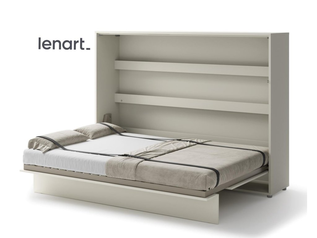 Široká výklopná postel 140 kašmír (béžová s nádechem šedé). Rozměry viz obrázek. Se sklápěcí postelí Vás už nebude trápit malý prostor Vaší domácnosti. Díky stabilní konstrukci zaručuje pohodlný odpočinek. Pneumatický mechanismus sklápění postele zajistí bezpečné otevírání a je doplněn SOFT CLOSE systémem tichého zavírání. Tento výjimečný systém Vám umožní manipulaci pouze jedním prstem. Když je postel sklopená, vypadá jako běžná skříň. Vyklopením se vytáhne celá šířka postele. Při lozložení postele má hloubku 168 cm. Uvnitř skříně jsou praktické police na knížky nebo dekorační předměty, vše máte na dosah ruky. Maximální zatížení polic je 5 kg. Rám je nutno přišroubovat ke zdi, nosnost postele je 200 kg. Rošt postele je v ceně, matrace není součástí, je potřeba ji dokoupit. Doporučujeme velikost 140 x 200 x výšku do 18 cm. Po sklopení postele vzniká prostor pod postelí o výšce 24,9 cm. Nábytek je vyroben z kvalitního lamina s ABS hranou. Lamino je odolné proti poškrábání, poškození, vlhkosti a vysokým teplotám. Postel nabízíme v několika velikostech a barevných provedeních. K posteli je možné dokoupit LED osvětlení. Dodáváme v demontovaném stavu. Můžete si prohlédnout prezentační video, klikněte ZDE.