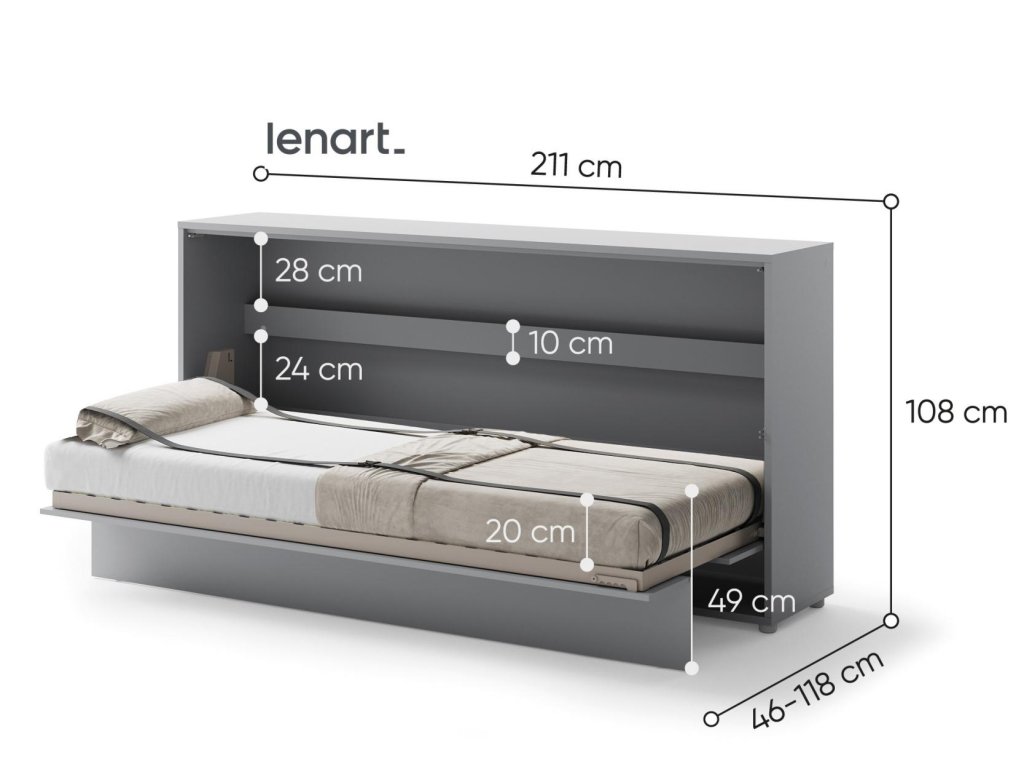 Široká výklopná postel 90 šedá mat. Rozměry viz obrázek. Se sklápěcí postelí Vás už nebude trápit malý prostor Vaší domácnosti. Díky stabilní konstrukci zaručuje pohodlný odpočinek. Pneumatický mechanismus sklápění postele zajistí bezpečné otevírání a je doplněn SOFT CLOSE systémem tichého zavírání. Tento výjimečný systém Vám umožní manipulaci pouze jedním prstem. Když je postel sklopená, vypadá jako běžná skříň. Vyklopením se vytáhne celá šířka postele. Při lozložení postele má hloubku 118 cm. Uvnitř skříně jsou praktické police na knížky nebo dekorační předměty, vše máte na dosah ruky. Maximální zatížení polic je 5 kg. Rám je nutno přišroubovat ke zdi, nosnost postele je 100 kg. Rošt postele je v ceně, matrace není součástí, je potřeba ji dokoupit. Doporučujeme velikost 90 x 200 x výšku do 18 cm. Po sklopení postele vzniká prostor pod postelí o výšce 24,9 cm. Nábytek je vyroben z kvalitního lamina s ABS hranou. Lamino je odolné proti poškrábání, poškození, vlhkosti a vysokým teplotám. Postel nabízíme v několika velikostech a barevných provedeních. K posteli je možné dokoupit LED osvětlení. Dodáváme v demontovaném stavu. Můžete si prohlédnout prezentační video, klikněte ZDE.