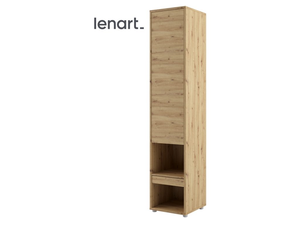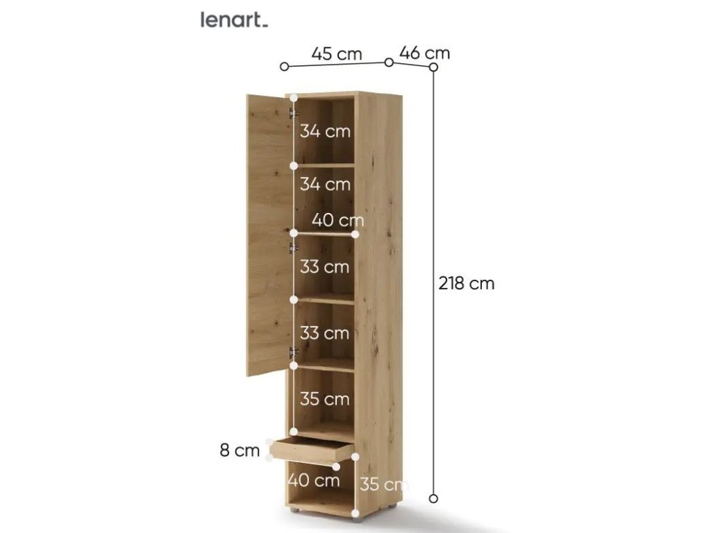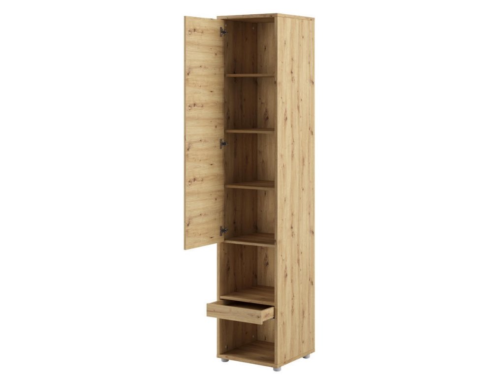 Policová skříň se zásuvkou barva dub artisan. Rozměry viz obrázek. Nábytek je vyroben z kvalitního lamina s ABS hranou. Lamino je odolné proti poškrábání, poškození, vlhkosti a vysokým teplotám. Dodáváme v demontovaném stavu