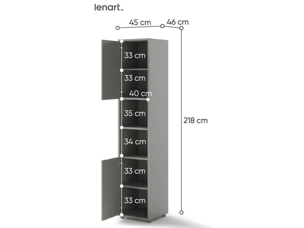 Policová skříň se dvěma dvířky šedá mat. Rozměry viz obrázek. Nábytek je vyroben z kvalitního lamina s ABS hranou. Lamino je odolné proti poškrábání, poškození, vlhkosti a vysokým teplotám. Dodáváme v demontovaném stavu.
