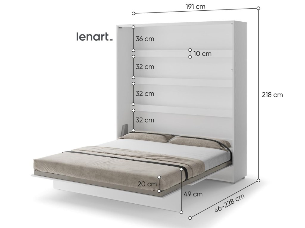 Vysoká výklopná postel 180 bílá mat. Rozměry viz obrázek. Se sklápěcí postelí Vás už nebude trápit malý prostor Vaší domácnosti. Díky stabilní konstrukci zaručuje pohodlný odpočinek. Pneumatický mechanismus sklápění postele zajistí bezpečné otevírání a je doplněn SOFT CLOSE systémem tichého zavírání. Tento výjimečný systém Vám umožní manipulaci pouze jedním prstem. Když je postel sklopená, vypadá jako běžná skříň. Vyklopením se vytáhne celá délka postele. Při lozložení postele má hloubku 228 cm. Uvnitř skříně jsou praktické police na knížky nebo dekorační předměty, vše máte na dosah ruky. Maximální zatížení polic je 5 kg. Rám je nutno přišroubovat ke zdi, nosnost postele je 200 kg. Rošt postele je v ceně, matrace není součástí, je potřeba ji dokoupit. Doporučujeme velikost 180 x 200 x výšku do 18 cm. Po sklopení postele vzniká prostor pod postelí o výšce 24,9 cm. Nábytek je vyroben z kvalitního lamina s ABS hranou. Lamino je odolné proti poškrábání, poškození, vlhkosti a vysokým teplotám. Postel nabízíme v několika velikostech a barevných provedeních. K posteli je možné dokoupit LED osvětlení. Dodáváme v demontovaném stavu. Můžete si prohlédnout prezentační video, klikněte ZDE.