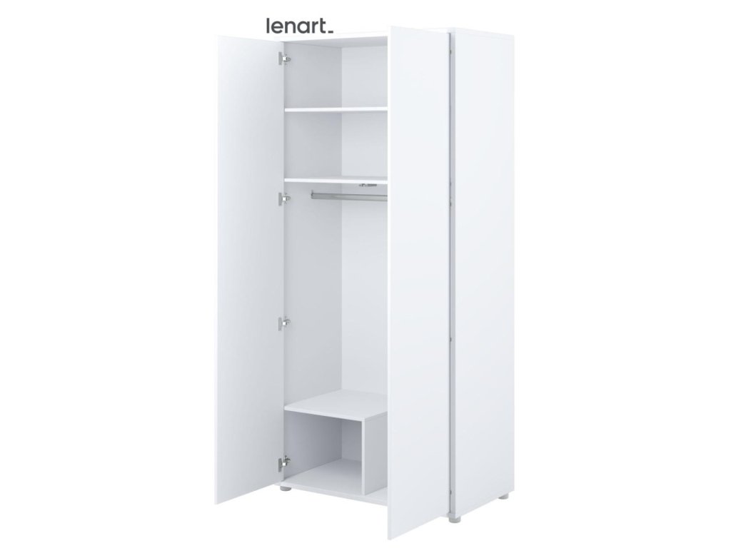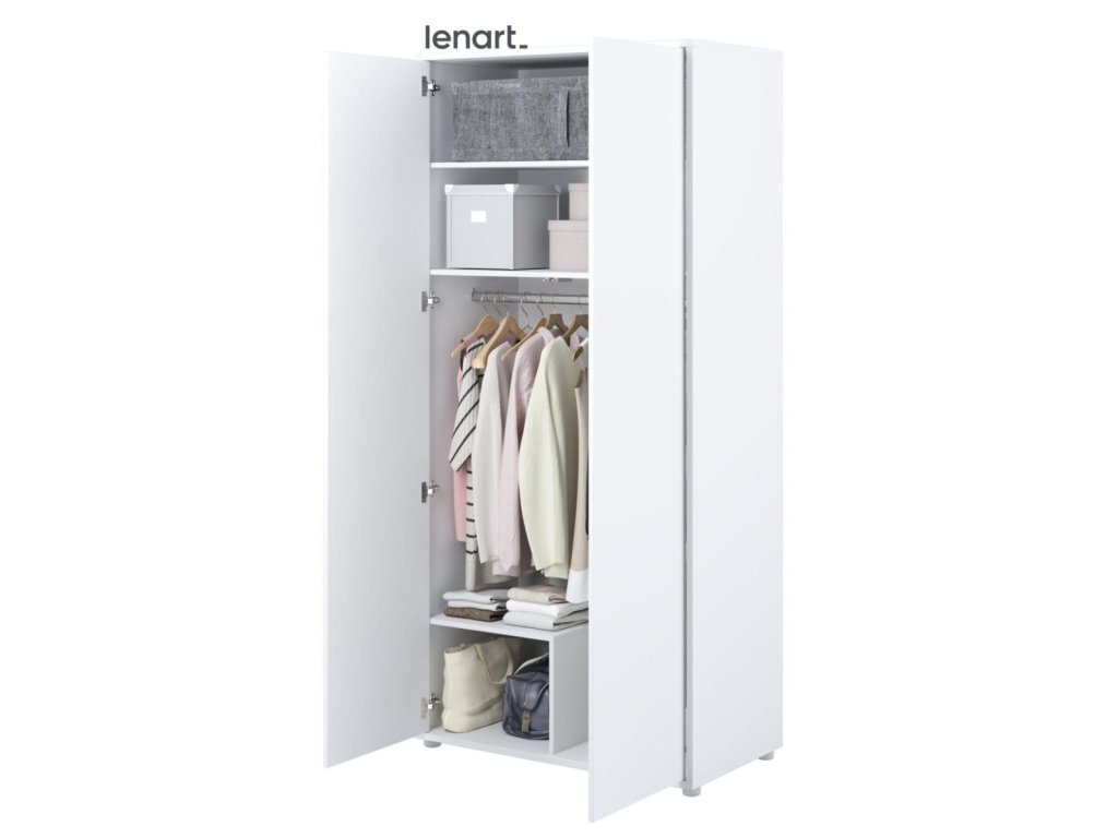 Šatní skříň se dvěma dvířky bílá lesk/bílá mat. Rozměry a vnitřní prostor viz obrázky. Nábytek je vyroben z kvalitního lamina s ABS hranou. Lamino je odolné proti poškrábání, poškození, vlhkosti a vysokým teplotám. Dodáváme v demontovaném stavu.Doplňkové parametry