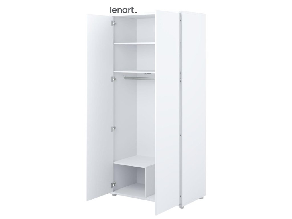 Šatní skříň se dvěma dvířky bílá mat. Rozměry a vnitřní prostor viz obrázky. Nábytek je vyroben z kvalitního lamina s ABS hranou. Lamino je odolné proti poškrábání, poškození, vlhkosti a vysokým teplotám. Dodáváme v demontovaném stavu.Doplňkové parametry
