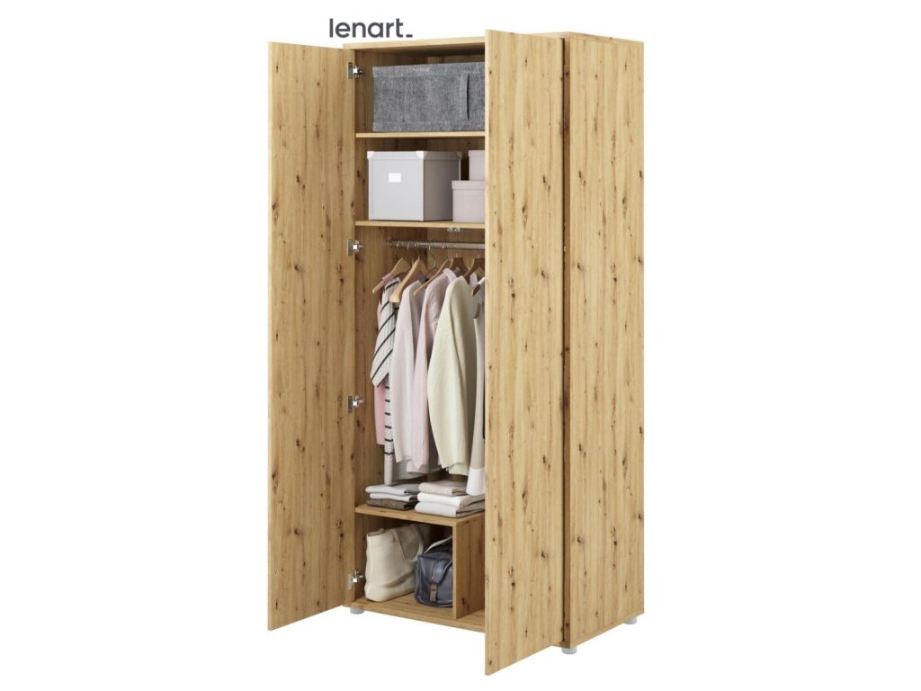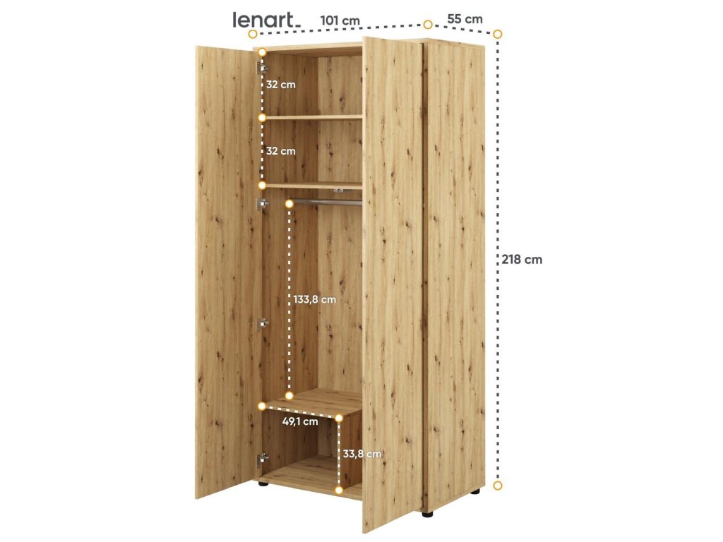 Šatní skříň se dvěma dvířky dub artisan. Rozměry a vnitřní prostor viz obrázky. Nábytek je vyroben z kvalitního lamina s ABS hranou. Lamino je odolné proti poškrábání, poškození, vlhkosti a vysokým teplotám. Dodáváme v demontovaném stavu.Doplňkové parametry