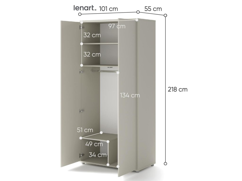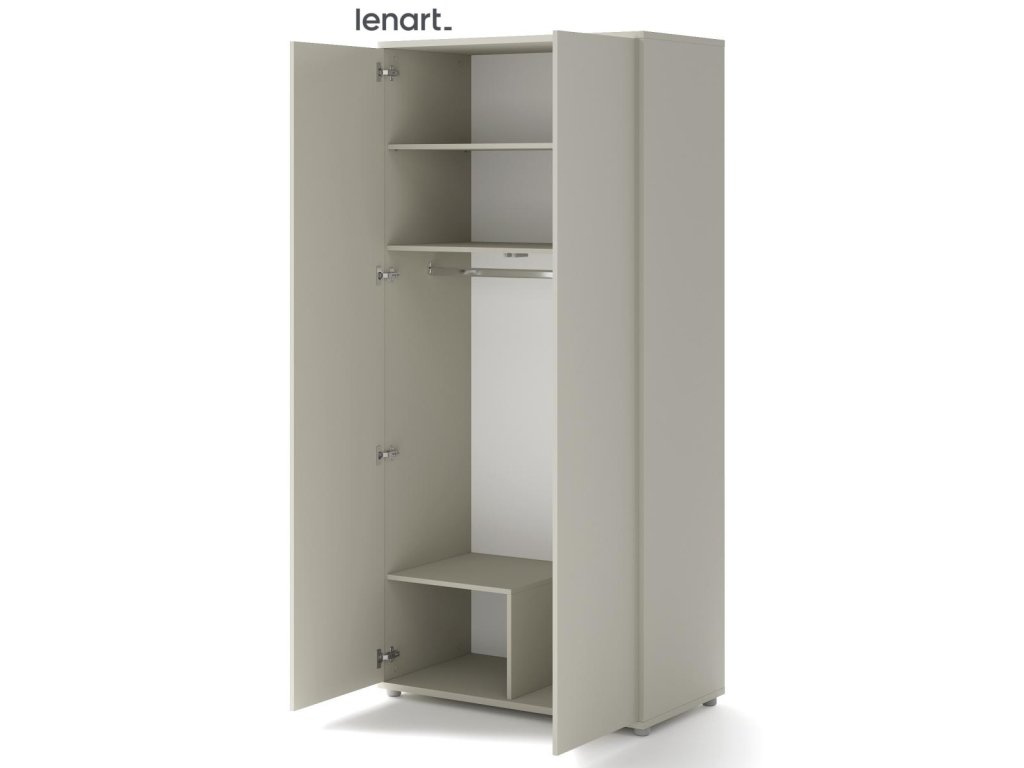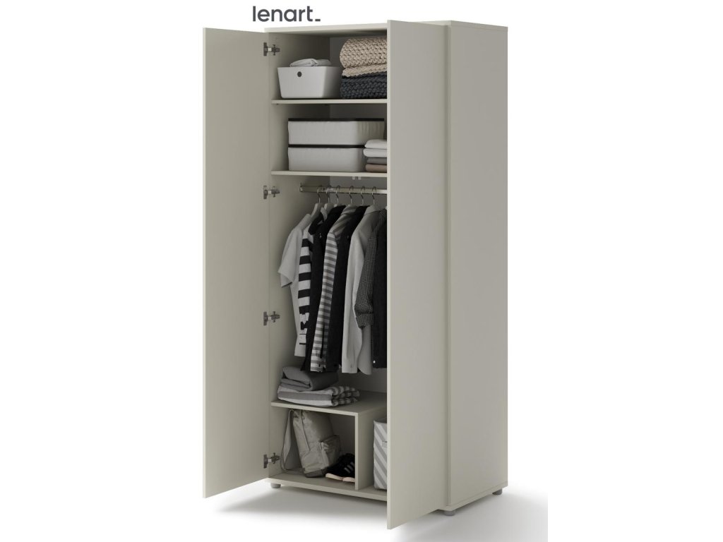Šatní skříň se dvěma dvířky kašmír (béžová s nádechem šedé). Rozměry a vnitřní prostor viz obrázky. Nábytek je vyroben z kvalitního lamina s ABS hranou. Lamino je odolné proti poškrábání, poškození, vlhkosti a vysokým teplotám. Dodáváme v demontovaném stavu.Doplňkové parametry