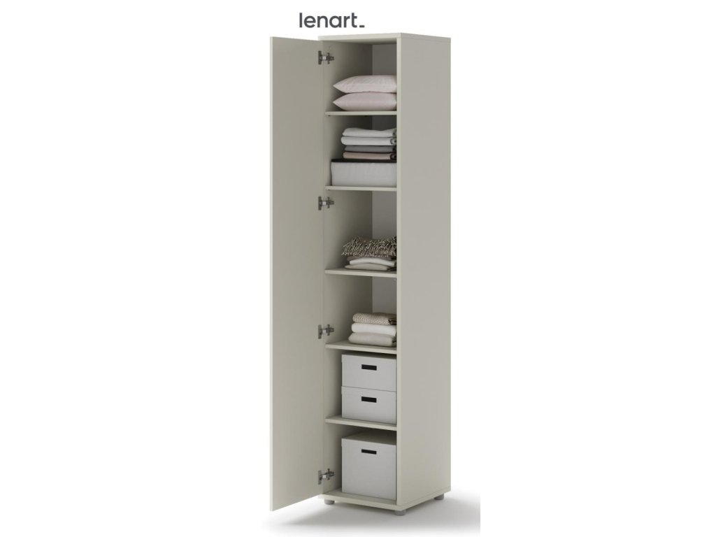 Policová skříň s dvířky kašmír (béžová s nádechem šedé). Rozměry a vnitřní prostor viz obrázky. Nábytek je vyroben z kvalitního lamina s ABS hranou. Lamino je odolné proti poškrábání, poškození, vlhkosti a vysokým teplotám. Dodáváme v demontovaném stavu.Doplňkové parametry