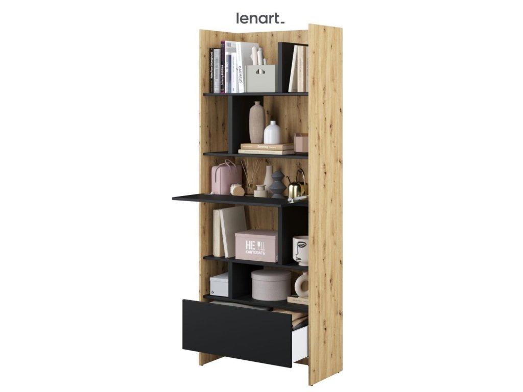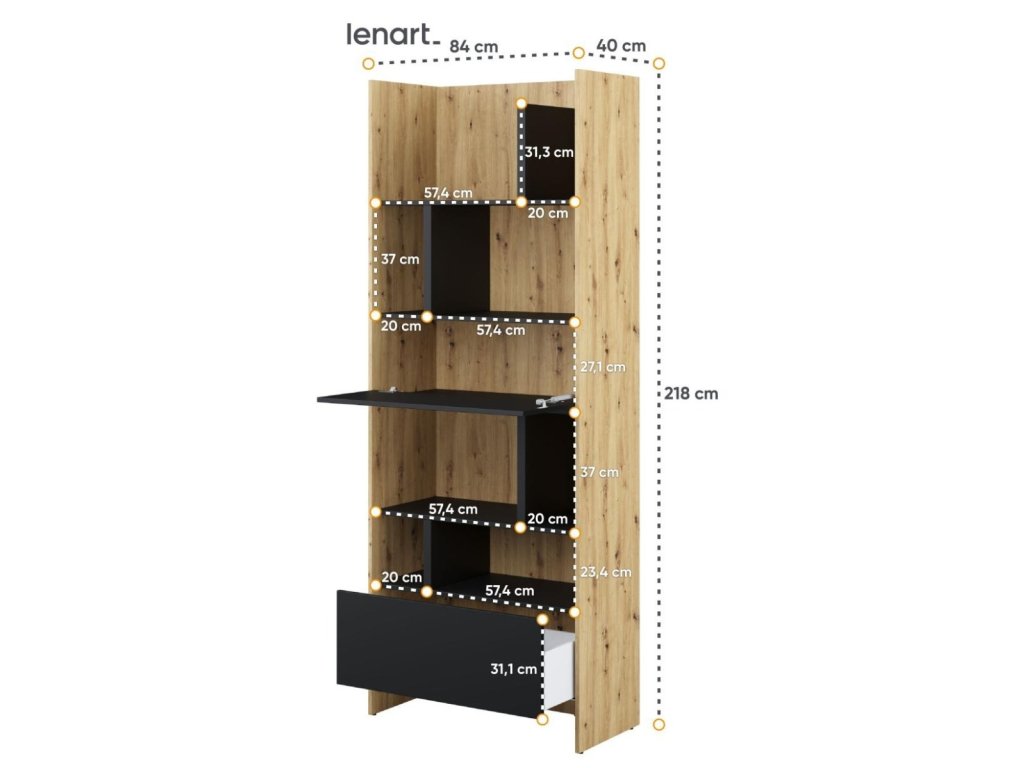 Regál s výklopnými dvířky a zásuvkou dub artisan/černá. Rozměry viz obrázek. Nábytek je vyroben z kvalitního lamina s ABS hranou. Lamino je odolné proti poškrábání, poškození, vlhkosti a vysokým teplotám. Dodáváme v demontovaném stavu.Doplňkové parametry