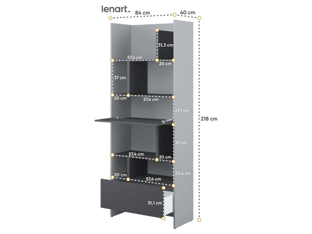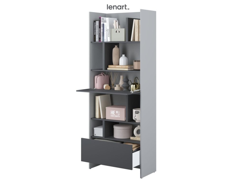 Regál s výklopnými dvířky a zásuvkou šedá/grafit. Rozměry viz obrázek. Nábytek je vyroben z kvalitního lamina s ABS hranou. Lamino je odolné proti poškrábání, poškození, vlhkosti a vysokým teplotám. Dodáváme v demontovaném stavu.Doplňkové parametry