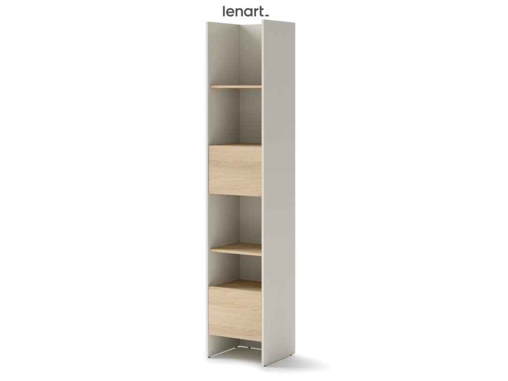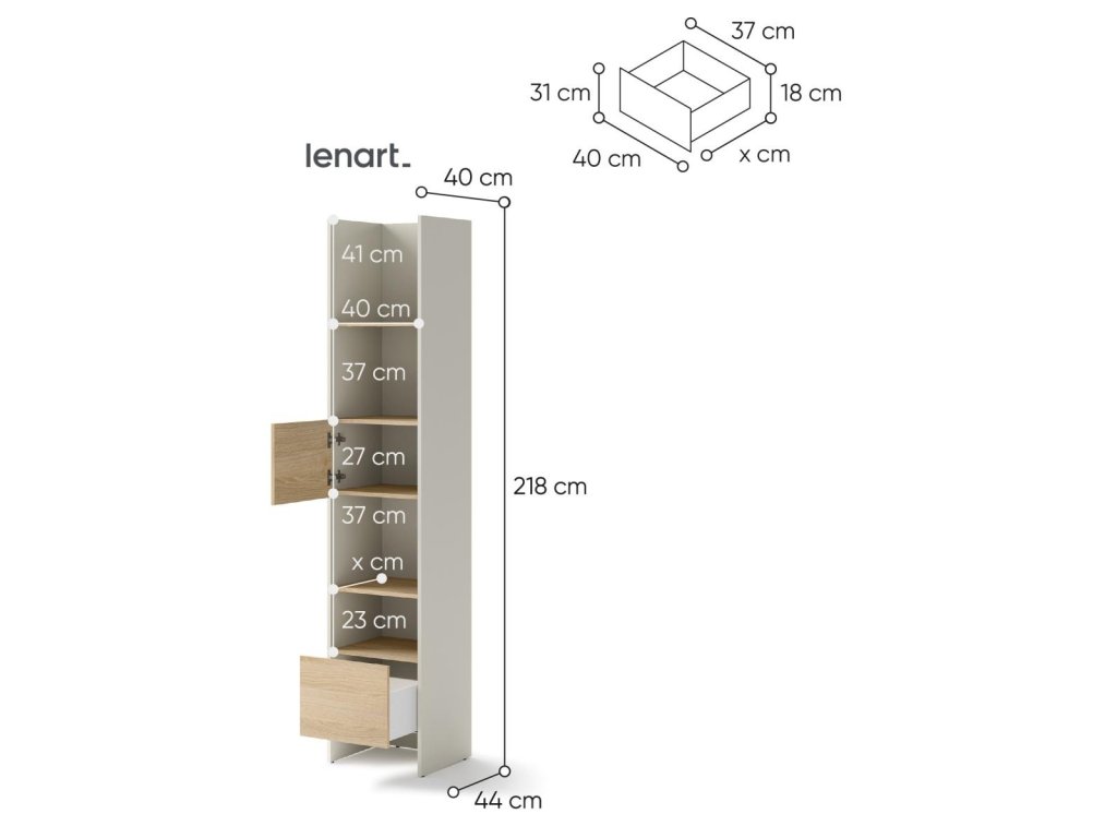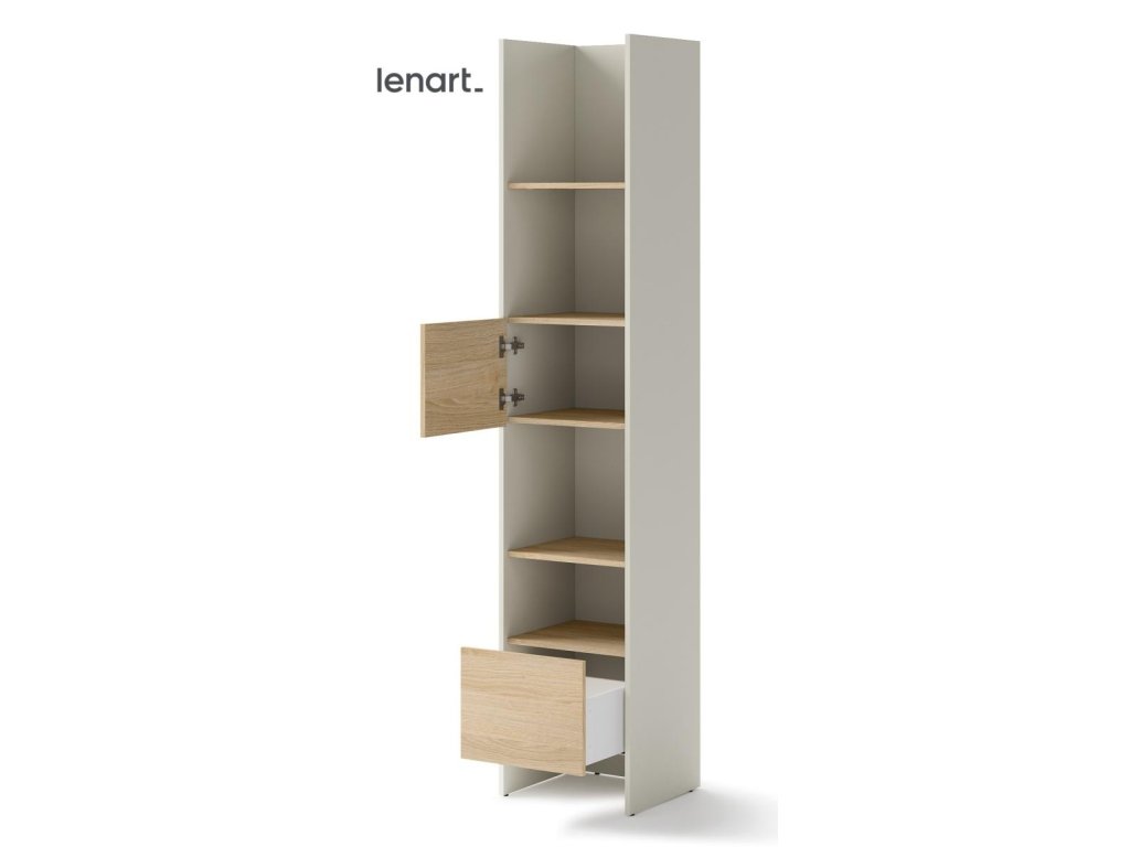 Regál s dvířky a zásuvkou kašmír/dub nagano. Rozměry viz obrázek. Nábytek je vyroben z kvalitního lamina s ABS hranou. Lamino je odolné proti poškrábání, poškození, vlhkosti a vysokým teplotám. Dodáváme v demontovaném stavu.