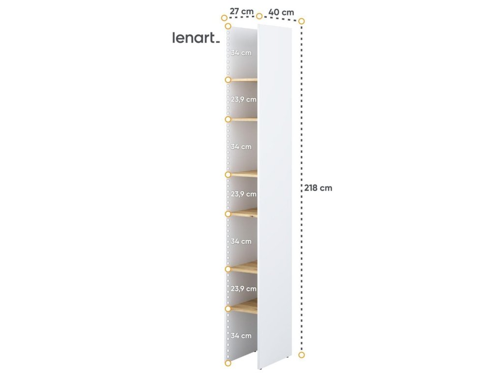 Regál barva bílá/dub artisan. Rozměry viz obrázek. Nábytek je vyroben z kvalitního lamina s ABS hranou. Lamino je odolné proti poškrábání, poškození, vlhkosti a vysokým teplotám. Dodáváme v demontovaném stavu.Doplňkové parametry