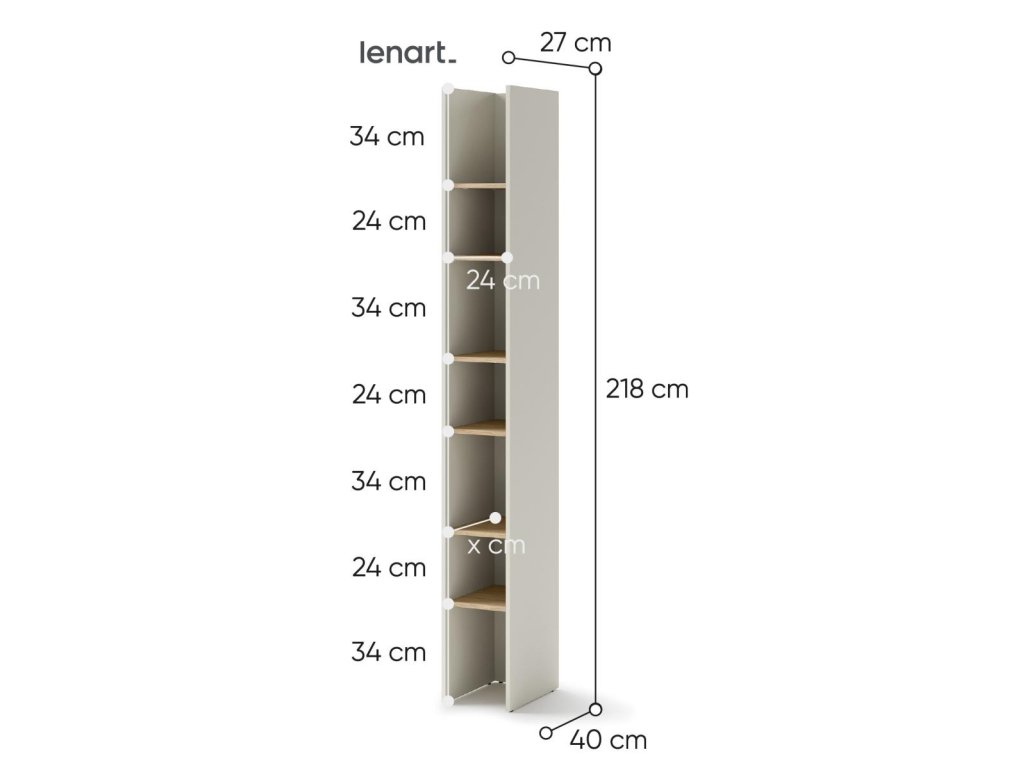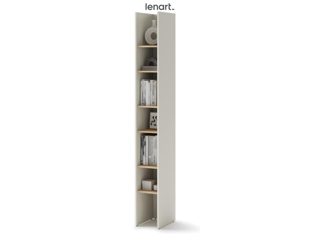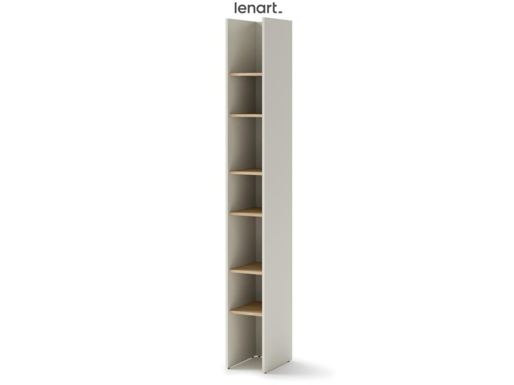 Regál barva kašmír/dub nagano. Rozměry viz obrázek. Nábytek je vyroben z kvalitního lamina s ABS hranou. Lamino je odolné proti poškrábání, poškození, vlhkosti a vysokým teplotám. Dodáváme v demontovaném stavu.