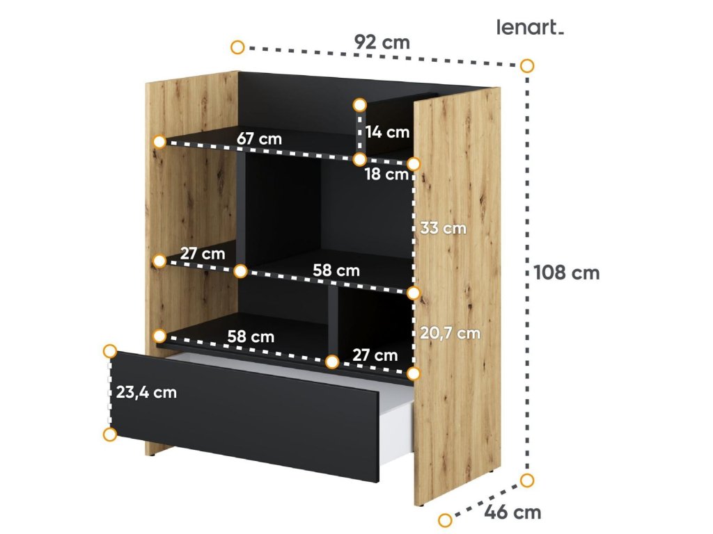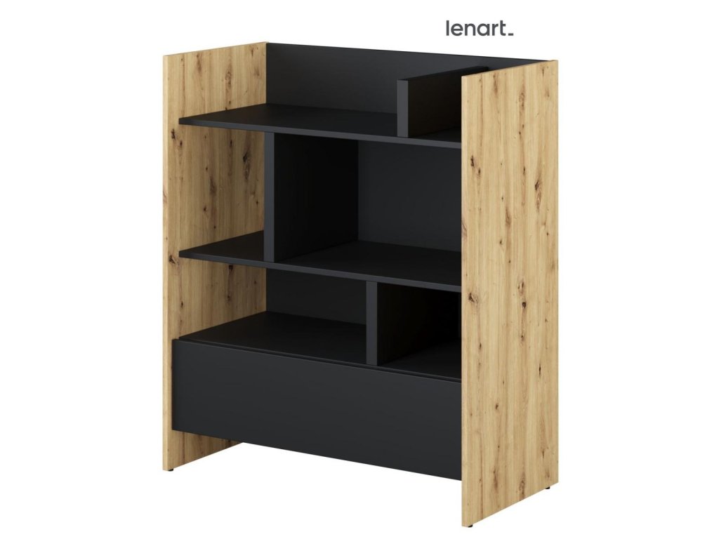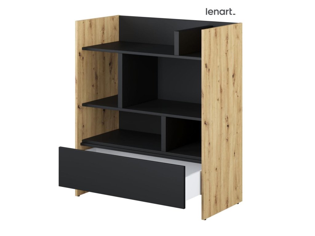 Regál se zásuvkou dub artisan/černá. Rozměry viz obrázek. Nábytek je vyroben z kvalitního lamina s ABS hranou. Lamino je odolné proti poškrábání, poškození, vlhkosti a vysokým teplotám. Dodáváme v demontovaném stavu.Doplňkové parametry