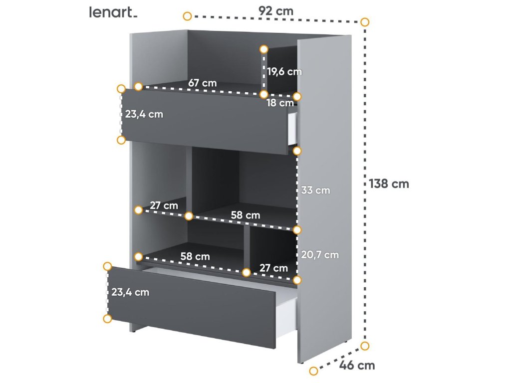 Regál se dvěma zásuvkami šedá/grafit. Rozměry viz obrázek. Nábytek je vyroben z kvalitního lamina s ABS hranou. Lamino je odolné proti poškrábání, poškození, vlhkosti a vysokým teplotám. Dodáváme v demontovaném stavu.Doplňkové parametry