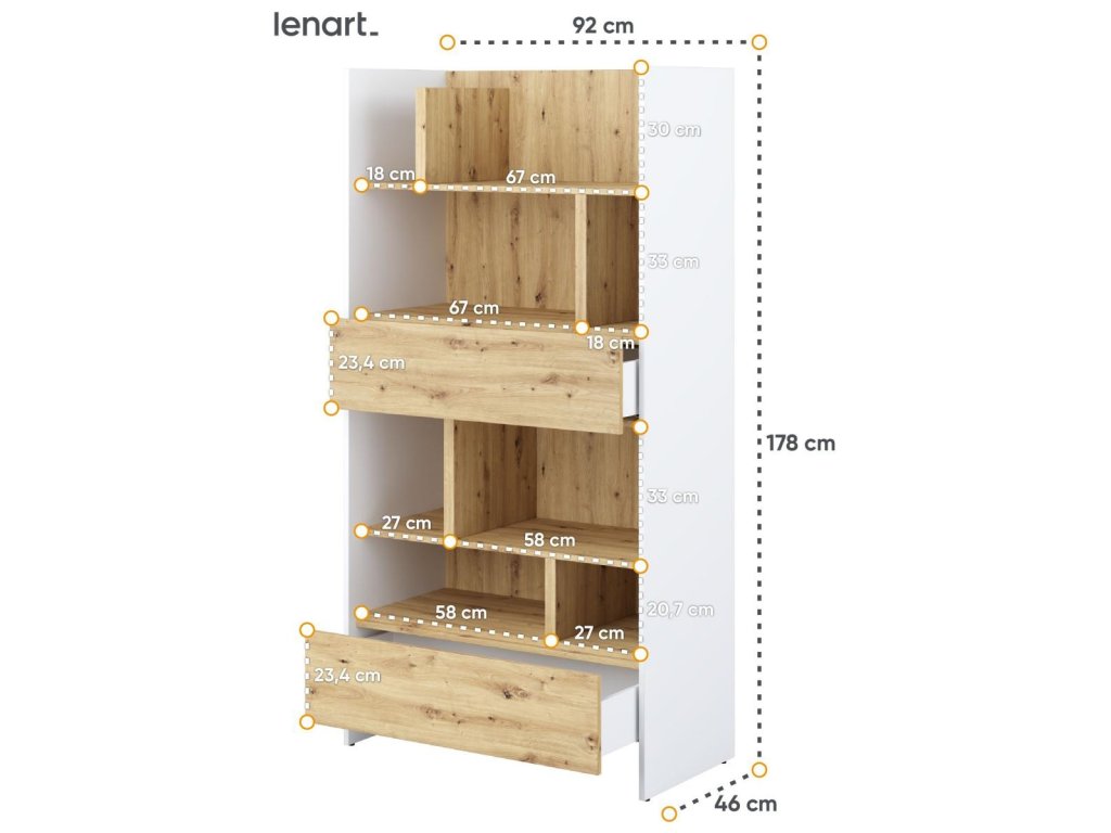 Regál se dvěma zásuvkami bílá/dub artisan. Rozměry viz obrázek. Nábytek je vyroben z kvalitního lamina s ABS hranou. Lamino je odolné proti poškrábání, poškození, vlhkosti a vysokým teplotám. Dodáváme v demontovaném stavu.Doplňkové parametry