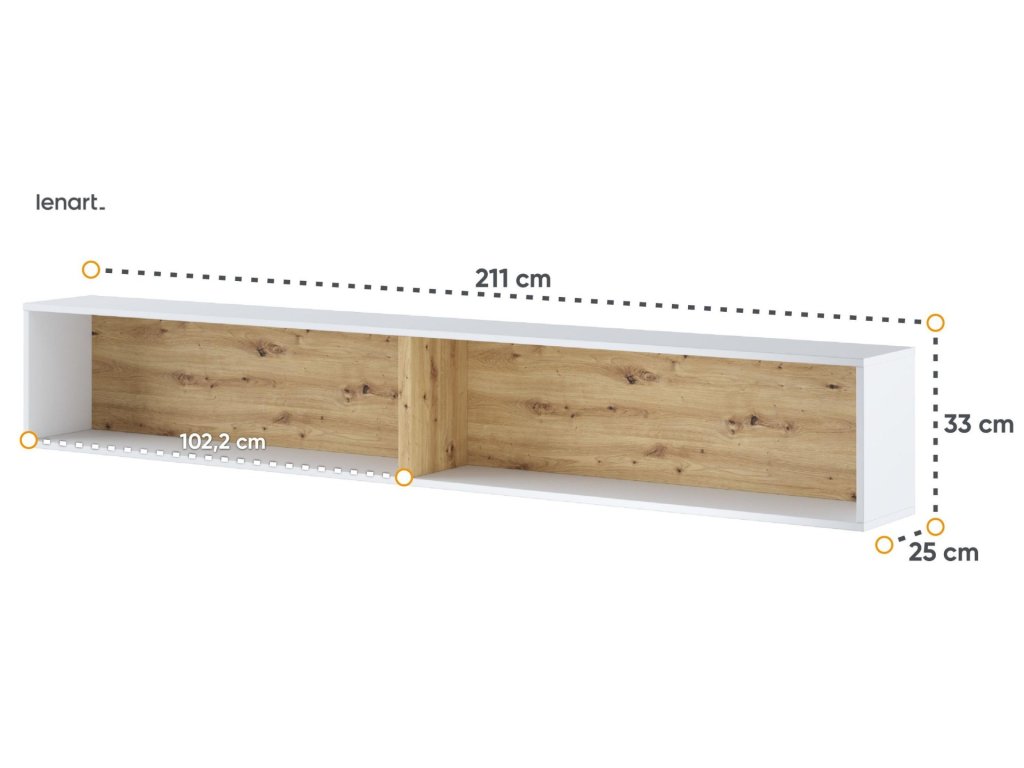 Závěsná police barva bílá/dub artisan. Rozměry viz obrázek. Nábytek je vyroben z kvalitního lamina s ABS hranou. Lamino je odolné proti poškrábání, poškození, vlhkosti a vysokým teplotám. Dodáváme v demontovaném stavu.Doplňkové parametry