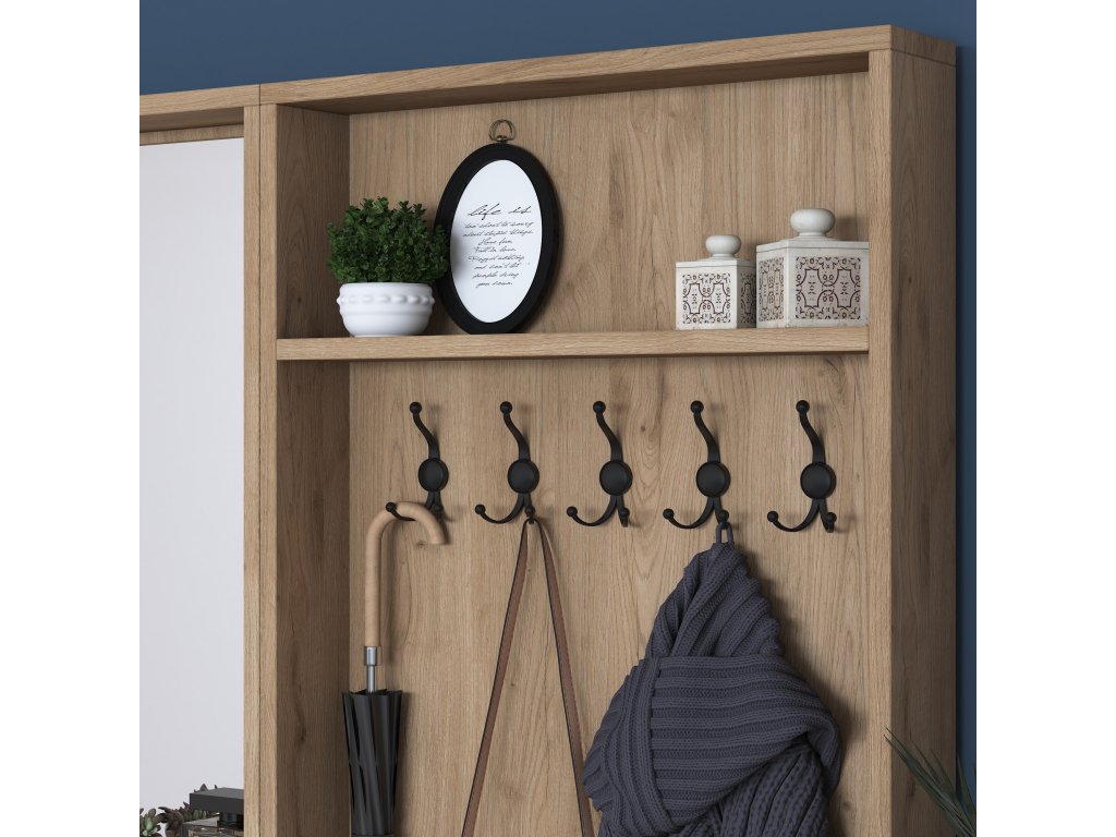 - Věšák: ideální pro zavěšení každodenního oblečení, tašek nebo šátků.