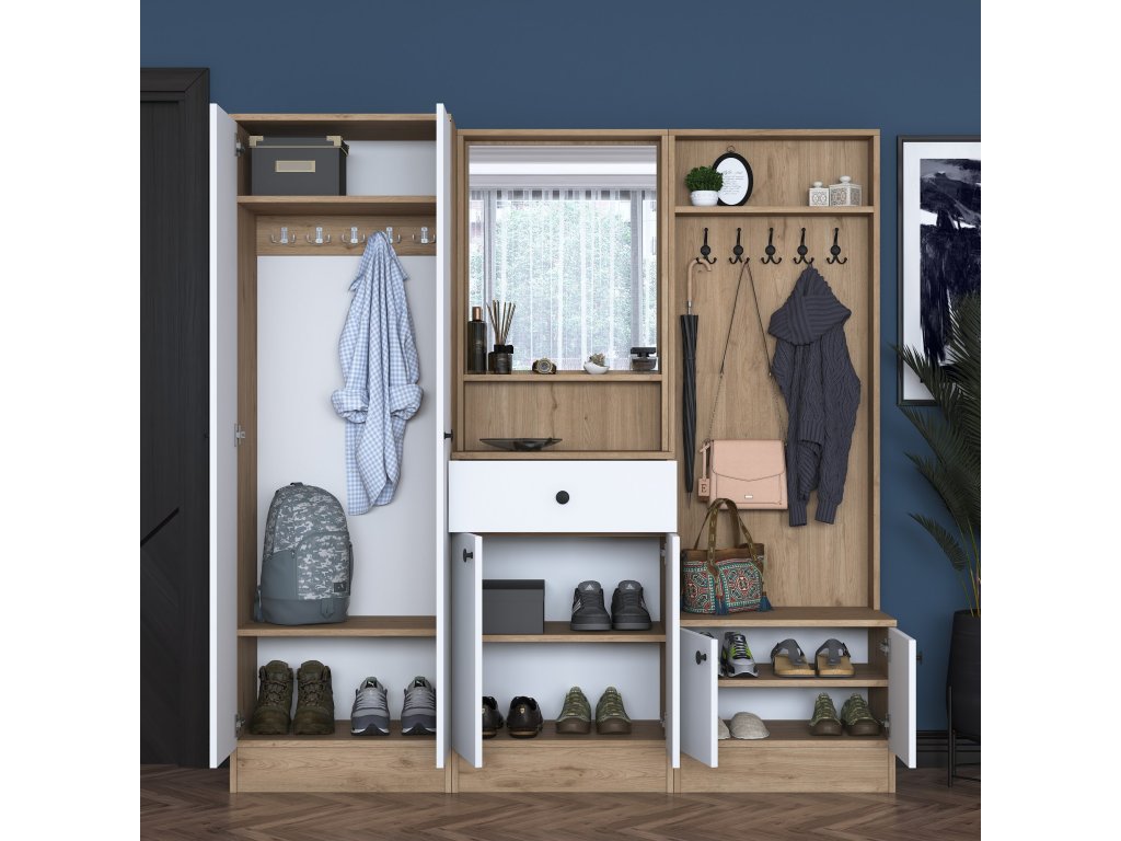 Předsíňová sestava BEER je navržena tak, aby splnila všechny potřeby moderní domácnosti. Nabízí dostatek úložného prostoru, přehlednou organizaci a elegantní vzhled, který zlepší první dojem z vašeho domova.