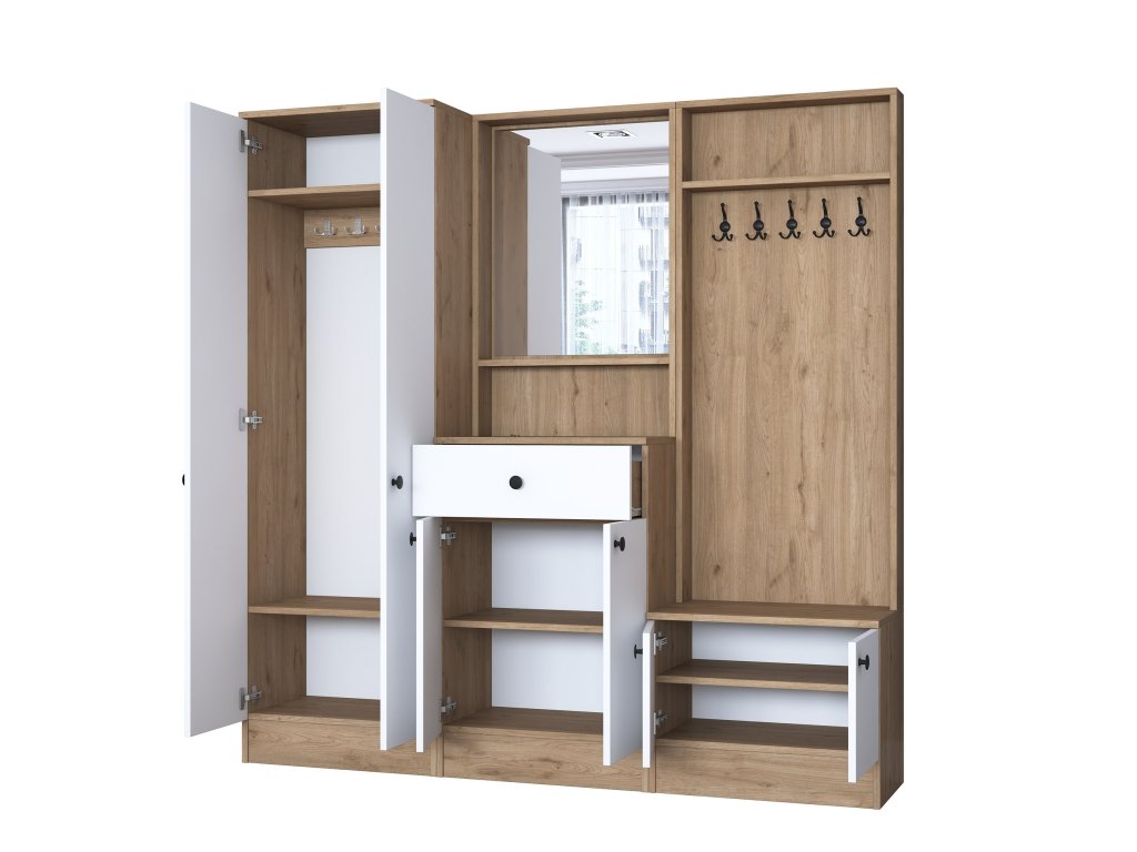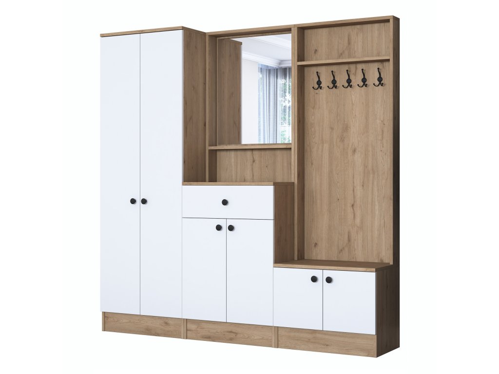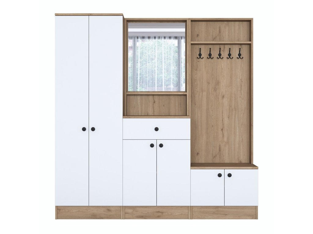 | Sestava obsahuje: | šatní skříň, skříně na boty, zrcadlo, věšák |