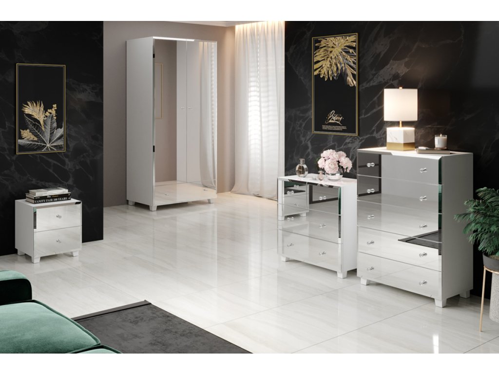 Stolek je vyroben z kvalitní LTD desky, která je nenáročná na údržbu. Na přední části se nacházejí praktická zrcadla, která opticky zvětší vaši ložnici. Úchyty jsou vyrobeny ve spojení kovu a skla. Jsou dekorativním prvkem nábytku BENNALIA. Barevné provedení: bílá, zrcadlo.