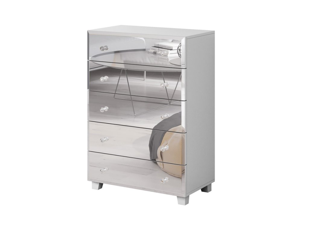 Komoda vyrobená z kvalitní LTD desky, která je nenáročná na údržbu. Na přední části se nacházejí praktická zrcadla, která opticky zvětší vaši ložnici. Úchyty jsou vyrobeny ve spojení kovu a skla. Jsou dekorativním prvkem nábytku BENNALIA. Barevné provedení: bílá, zrcadlo.