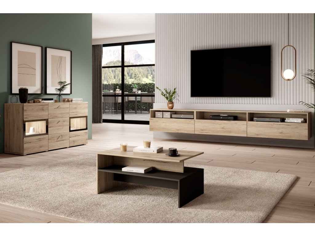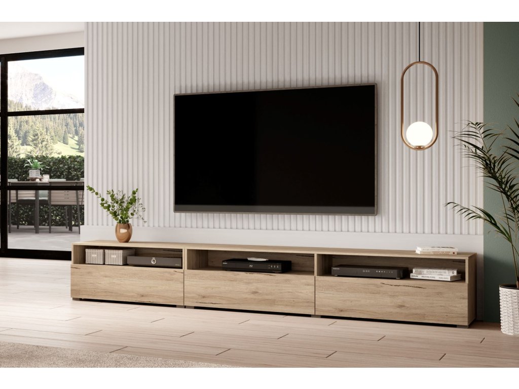 TV skříňka může stát na podlaze ale díky věšákům, které jsou součástí sestavy se může velmi rychle stát závěsným kusem nábytku. V zadních částech poskytuje praktické otvory pro vedení kabelů na TV příslušenství a jinou elektroniku. Komoda je tvořena třemi výklopnými dvířky s bezúchytkovým systémem. Barevné provedení dub san remo.