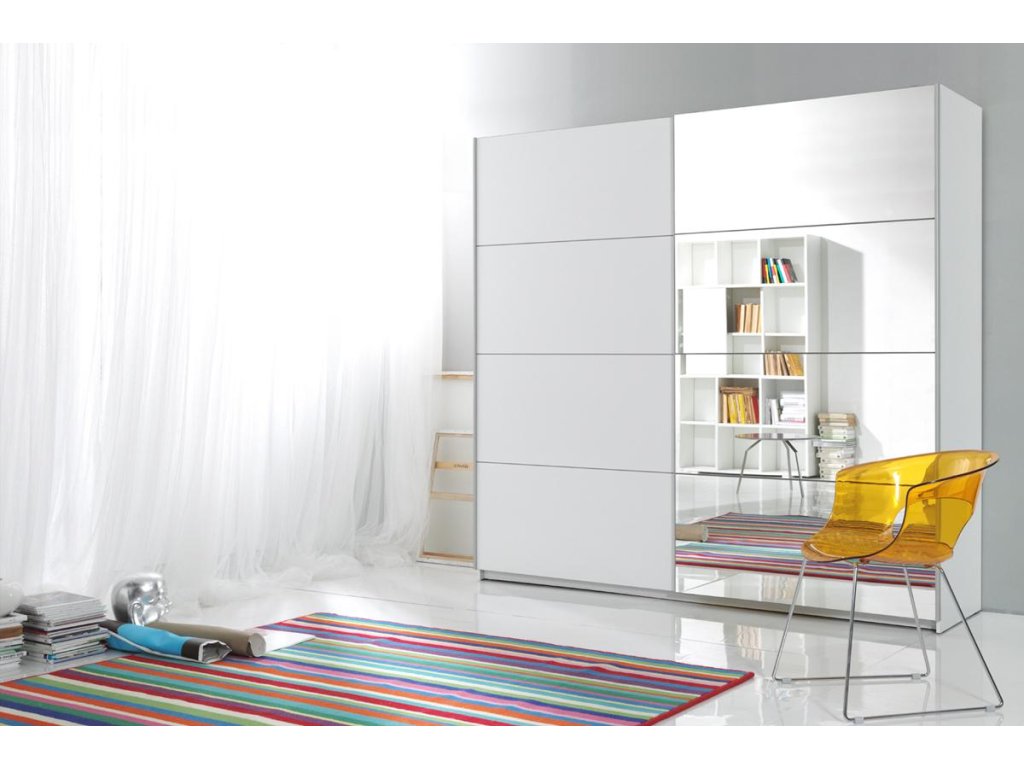 Ve spojení s jejím elegantním a moderním designem se stane nedílnou součástí vaší domácnosti. Posuvné dveře umožňují ještě lepší využití prostoru a dobrou manipulaci s nábytkem. Můžete si je doplnit o funkci tichého zavírání (není součástí, nutno doobjednat). Provedení skříně je v kombinaci lamino desky a zrcadla, které je umístěno na celých jedních dveřích. Tím se dosáhne efektu zvětšení prostoru. Nábytek je v bílé barvě.