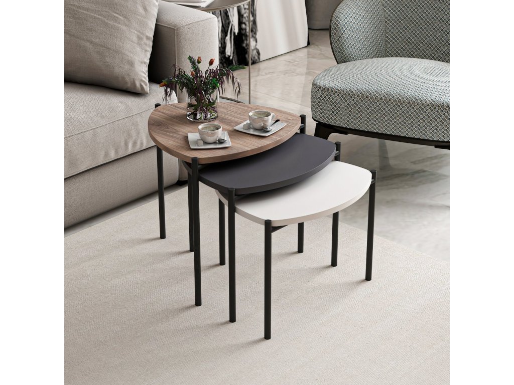 Set konferenčních stolků BIGI nabízí stylové a praktické řešení pro moderní obývací pokoje. Tato sada obsahuje tři stolky různých velikostí, které lze snadno kombinovat nebo používat samostatně. Design v barevném provedení bílá, antracit a ořech s kovovými nohami dodává stolkům nadčasový vzhled.