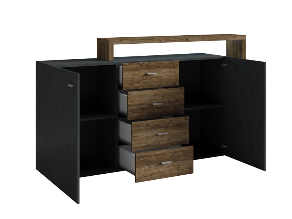 Komoda je dvoudveřová. V každé části se nachází jedna police. Ve střední části se nacházejí čtyři praktické zásuvky. Disponuje také nástavbou s otevřenými úložnými prostory, kam si můžete uložit knihy, dekorace a podobně.