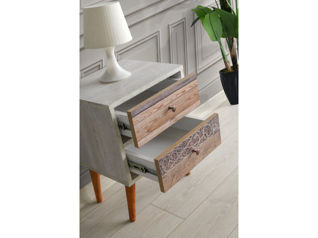 Náš noční stolek se dvěma prostornými zásuvkami nabízí dostatek úložného prostoru pro všechny vaše nezbytnosti před spaním. Od knih po nabíječky – vše můžete mít na dosah ruky, takže je to pohodlné a bezproblémové. Dřevěné nohy nejenže zajišťují stabilitu, ale také dodávají celkovému designu nádech elegance. S výškou nohy 21 cm dokonale vyvažují proporce nočního stolku.