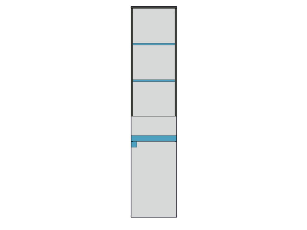 Regál 1S1D z dětského sektoru BOBY. Korpus skříňky má barevný odstín šedý grafit, přední části jsou bílé. Úchytky a regálová část mají barvu modrá. Materiál lamino deska. Rozměry v/š/h 188 x 40 x 35 cm. Dodáváme v demontovaném stavu. Dětský sektor BOBY je se svým svěžím designem vhodný do moderních dětských či studentských pokojů.Doplňkové parametry