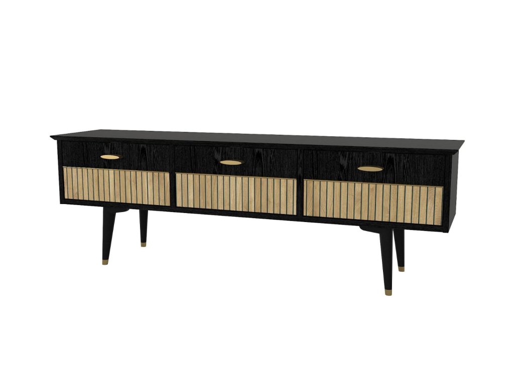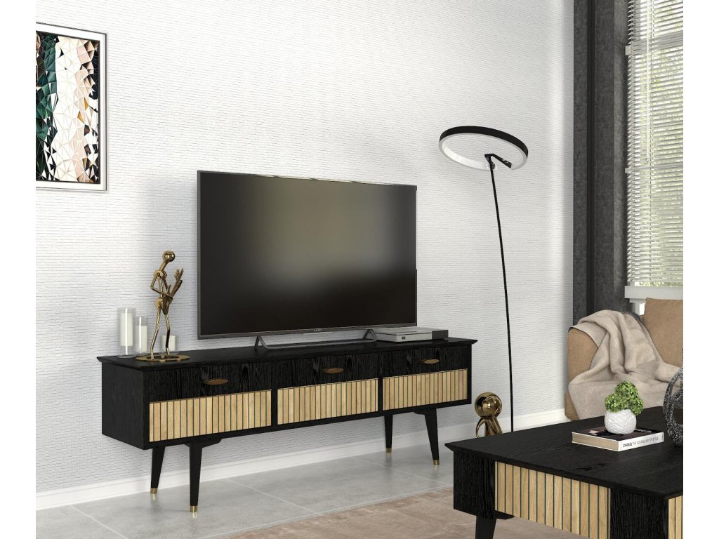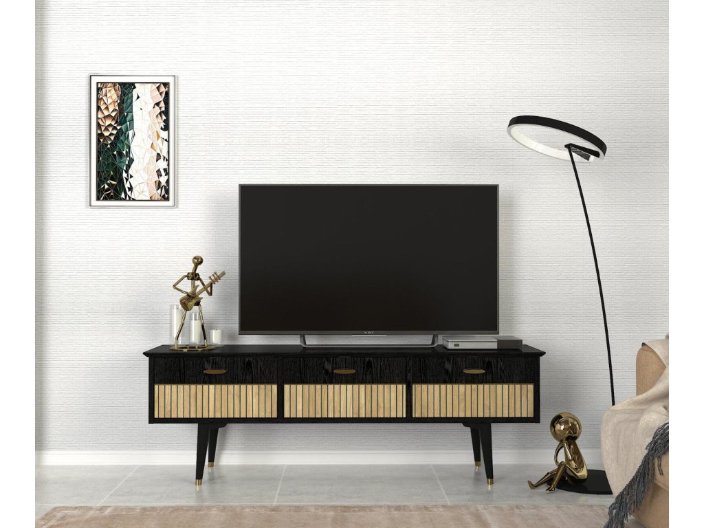 TV stolek BOLERO nabízí dostatek úložného prostoru díky třem dvířkům, za kterými se skrývá praktická skříňka. Jeho robustní konstrukce z materiálu LTD s tloušťkou 18 mm zajišťuje dlouhou životnost a stabilitu. Kombinace černé a světle hnědé barvy dodá vašemu obývacímu pokoji moderní a elegantní vzhled.