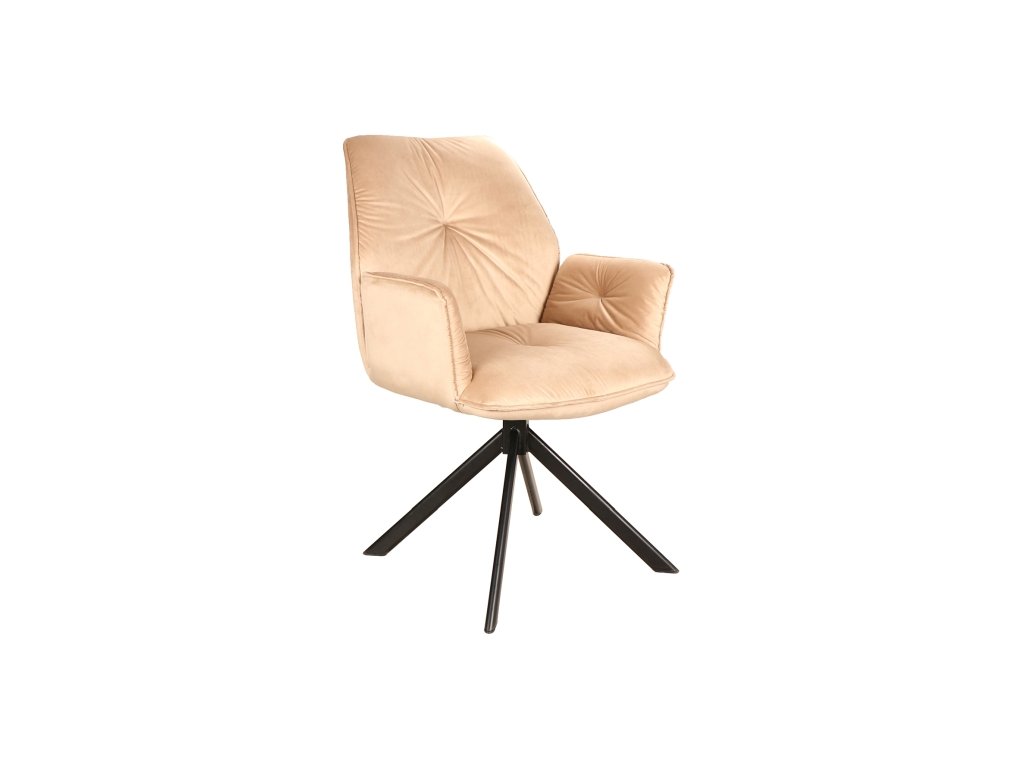 Křeslo je čalouněno kvalitní látkou v barevném odstínu béžová bluvel 28. Nohy židle jsou kovové, v černé barvě.