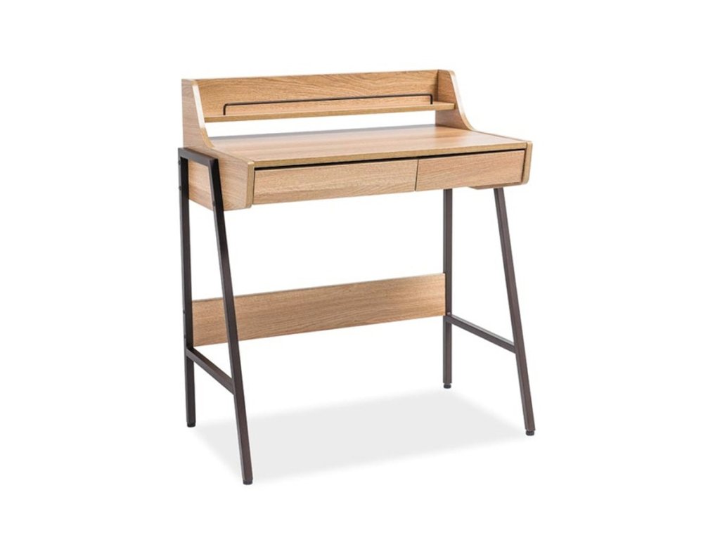 Výjimečný pracovní stůl BORIS B168 nabízí stylový systém odkládacího prostoru. Díky němu je efektně využita celá plocha stolu. Oceníte praktickou otevřenou poličku s kovovou zábranou i 2 šuplíky. Systém otevírání je bezúchytový. Stůl patří k menším nábytkům, proto je ideální také do menších prostor, případně na zařízení pracovního koutu. Pracovní část stolu je vyrobena z kvalitních MDF desek v provedení dub. Konstrukce je kovová, v barevném provedení tmavý bronz. Tento materiál se snadno udržuje, což ocení každý majitel. Maximální nosnost je 40 kg. Rozměry (š/v/hv cm): 89 x 77 x 48. Dodáváme v demontu.Doplňkové parametry