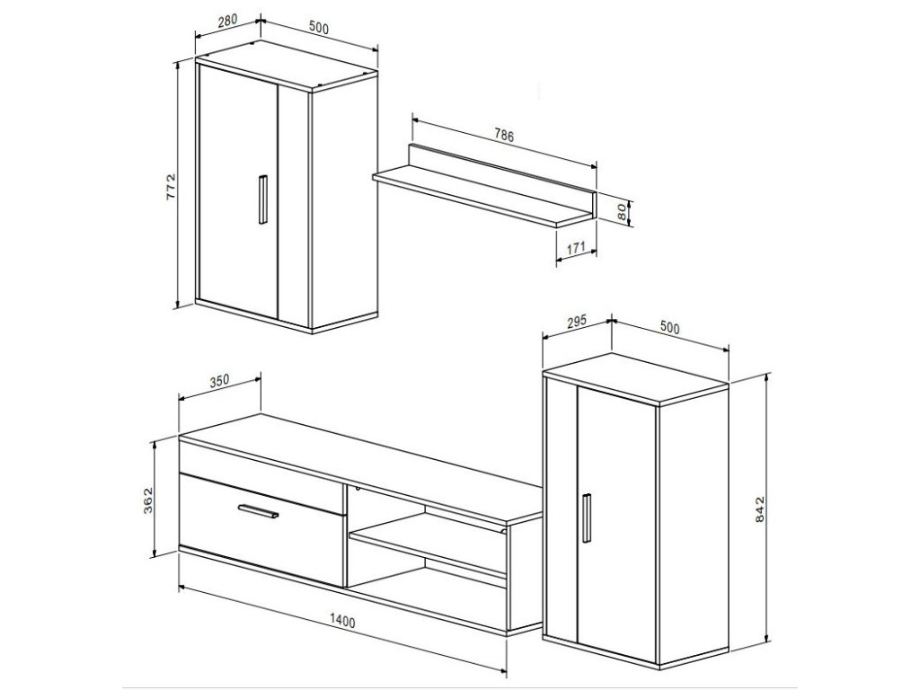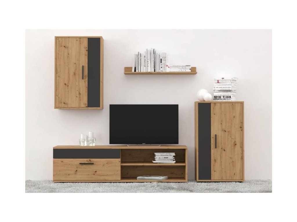 | Sestava obsahuje: | TV stolek, skříňku volně stojící, skříňku závěsnou, závěsnou polici |