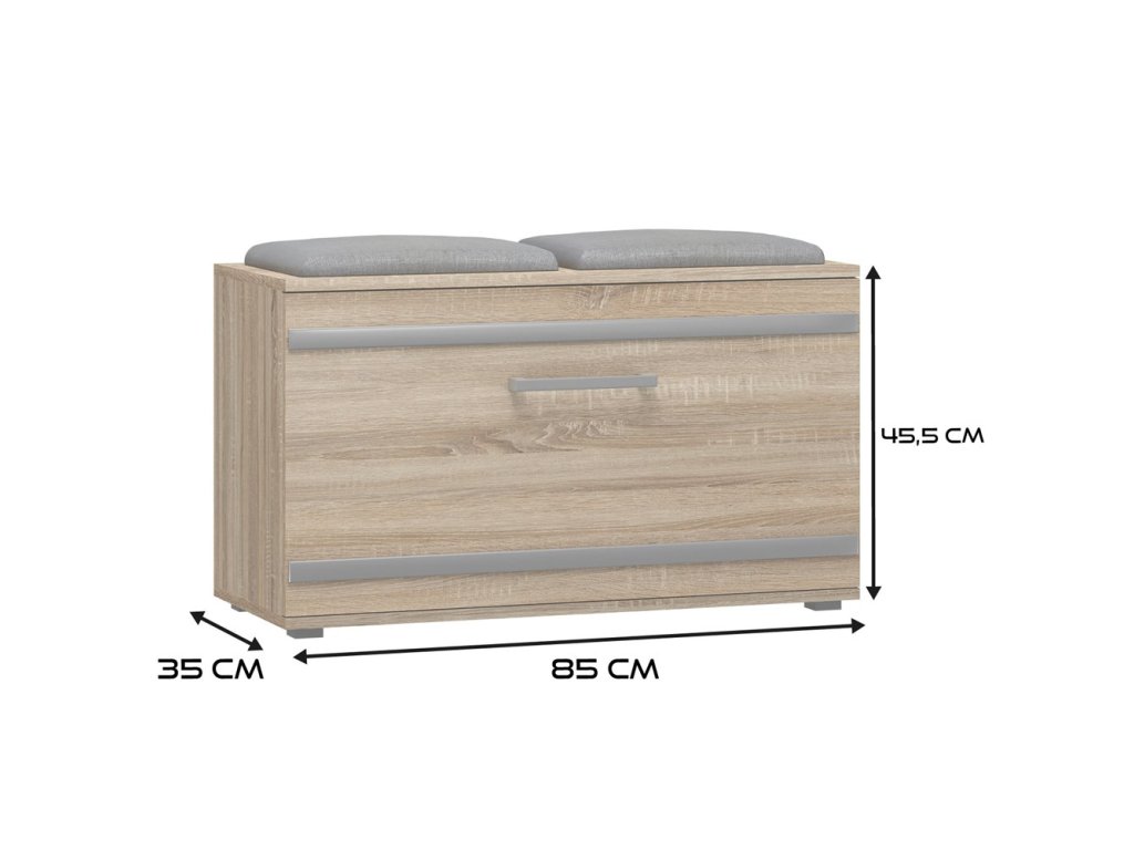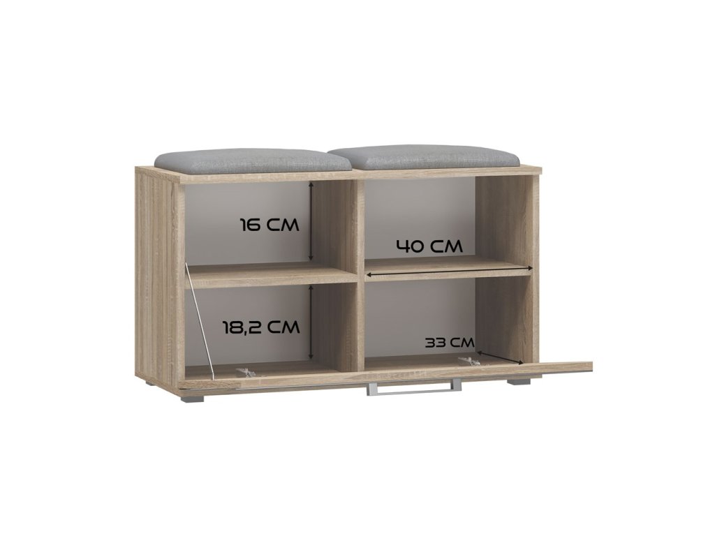 - Botník PEORIA je vybaven výklopnými přihrádkami, které nabízejí dostatek prostoru pro organizované a přehledné uložení obuvi, a doplněn o pohodlný polštářek na sedení pro pohodlné obouvání a vyzouvání.