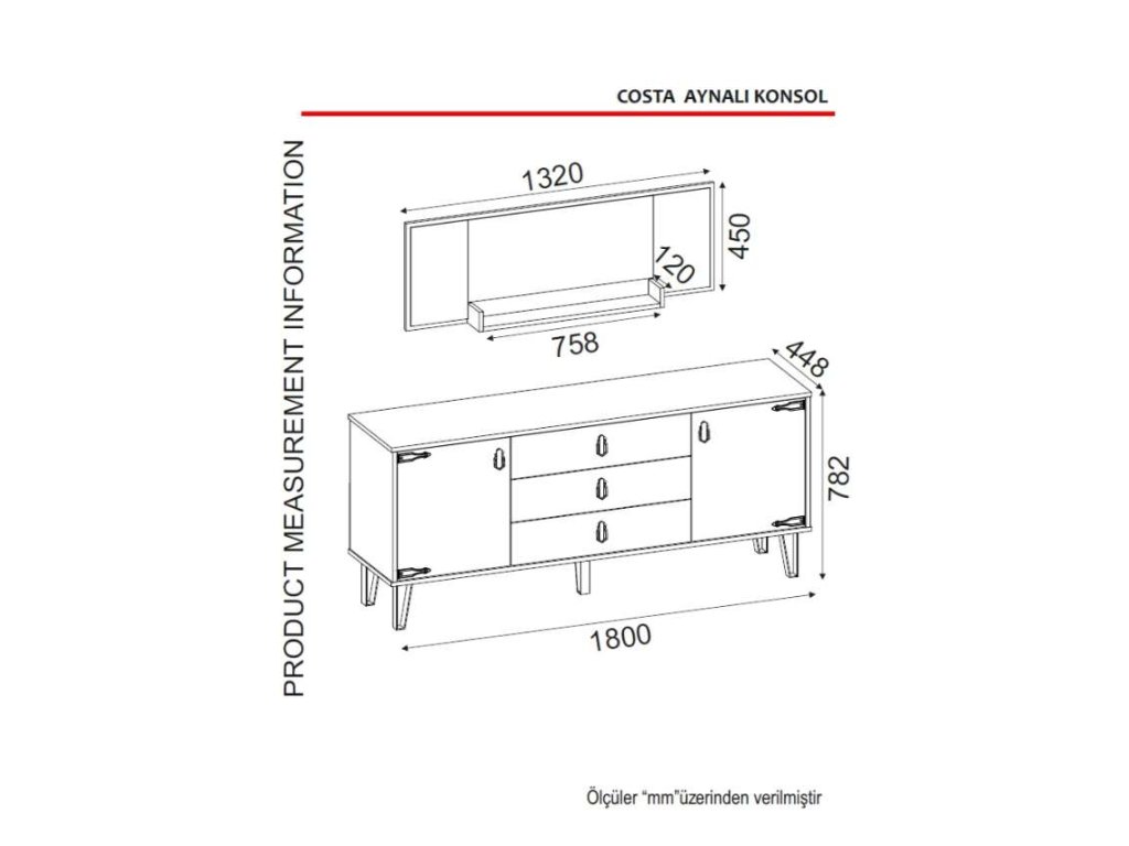 - Sestava obsahuje: Komoda (š180 x h45 x v78 cm), nástěnné zrcadlo (š132 x h12 x v45 cm)