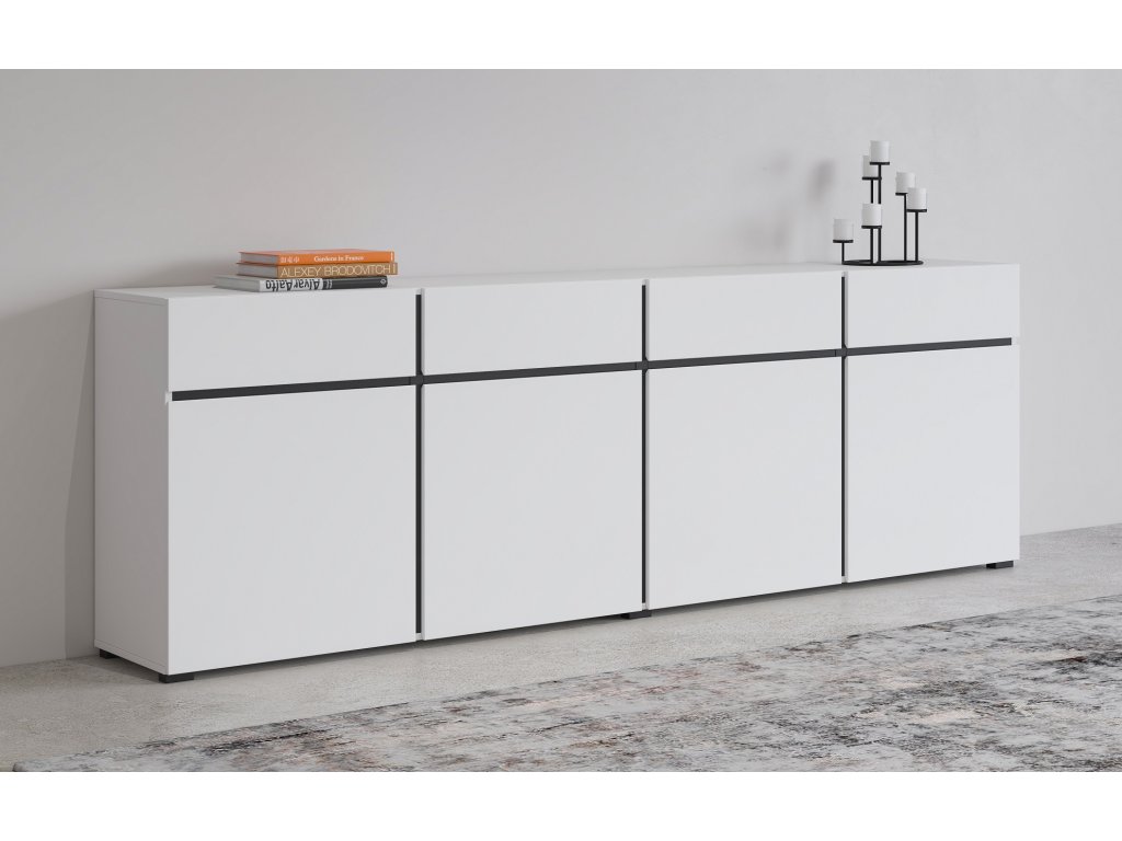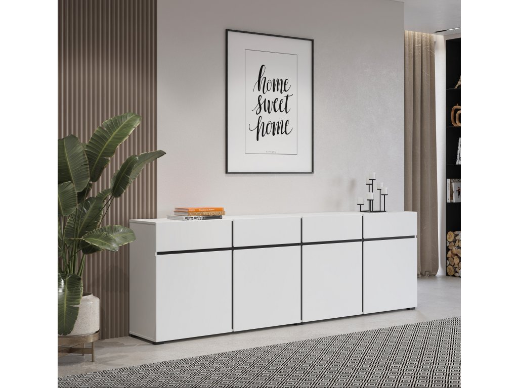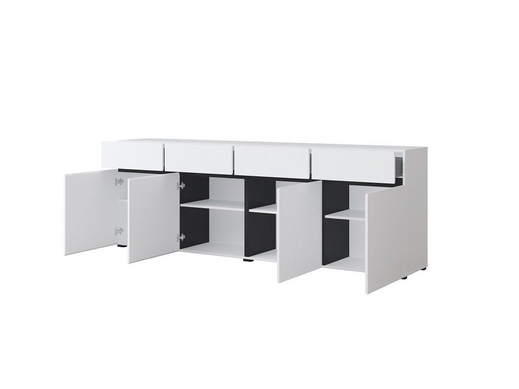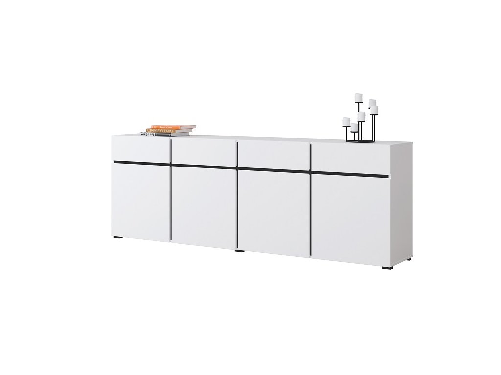 Tato moderní komoda je vyrobena z kvalitních LTD desek, které se snadno udržují. Je čtyřdveřová, disponuje také čtyřmi zásuvkami.