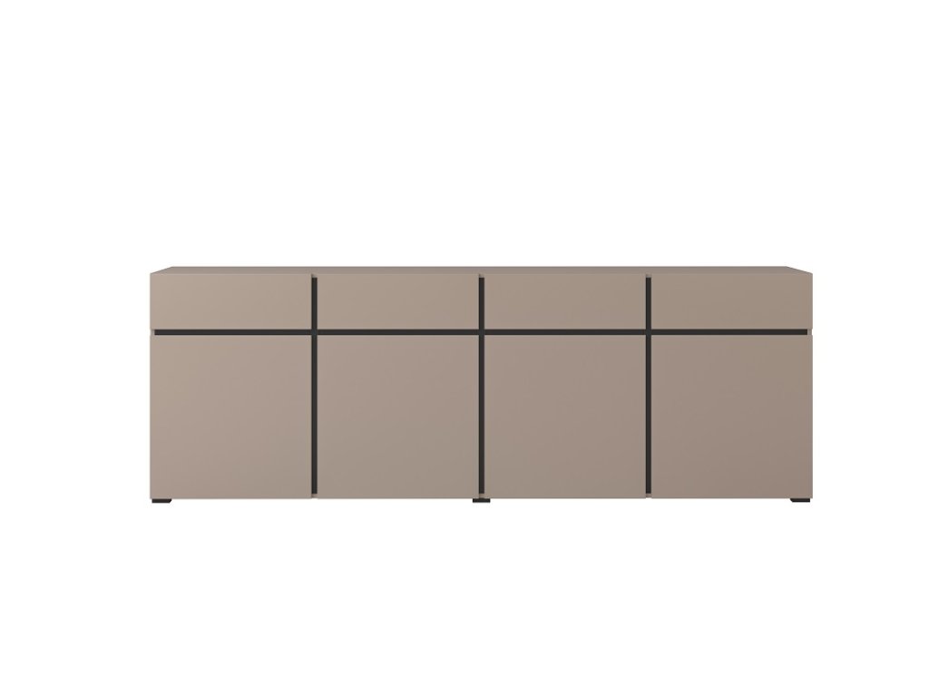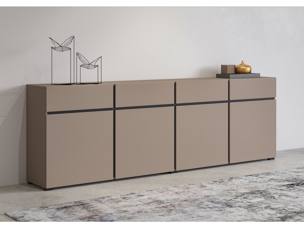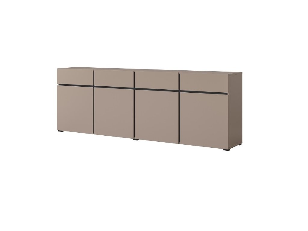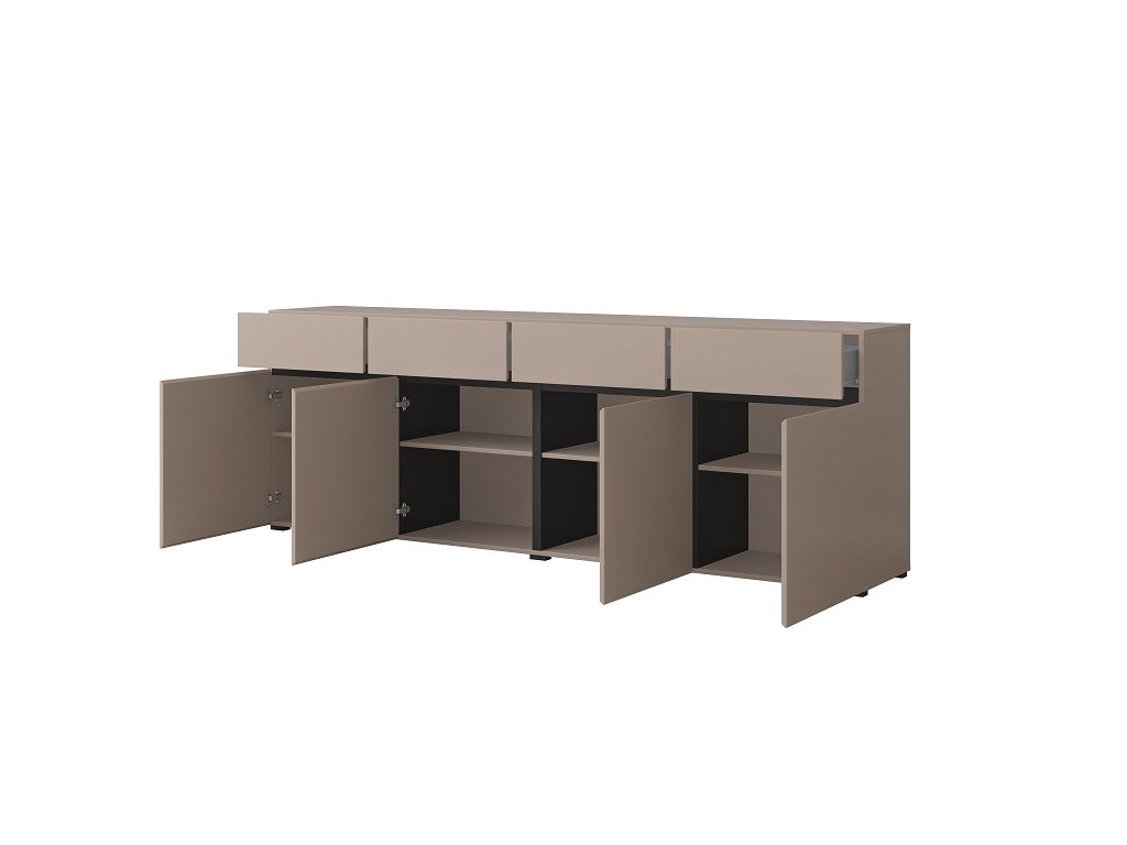 Tato moderní komoda je vyrobena z kvalitních LTD desek, které se snadno udržují. Je čtyřdveřová, disponuje také čtyřmi zásuvkami.