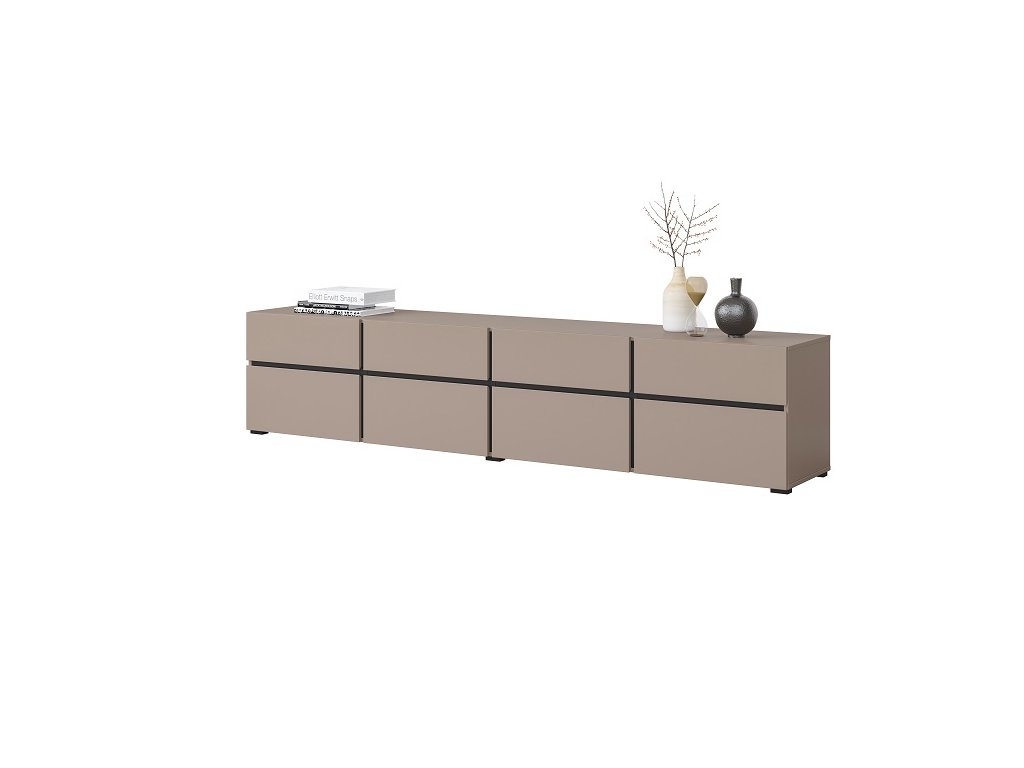 Tento moderní televizní stolek je vyroben z kvalitních LTD desek, které se snadno udržují. Disponuje čtyřmi výklopnými přihrádkami a čtyřmi zásuvkami.