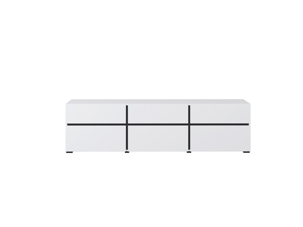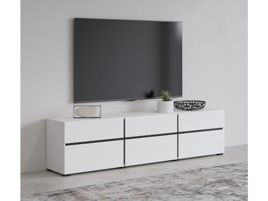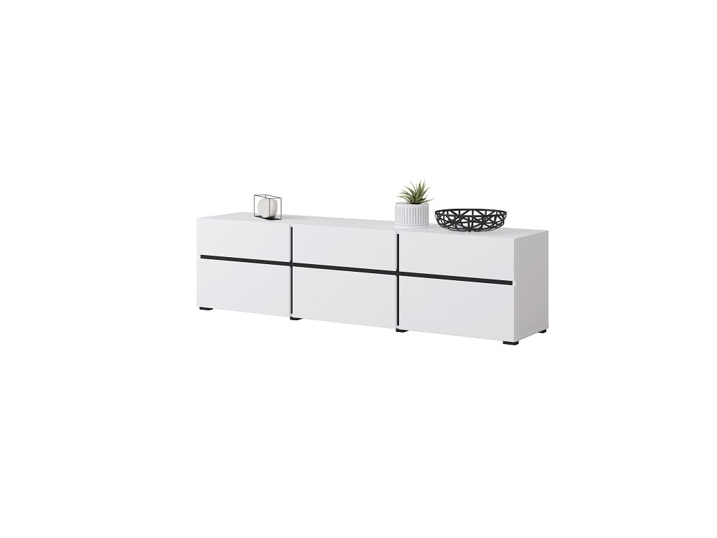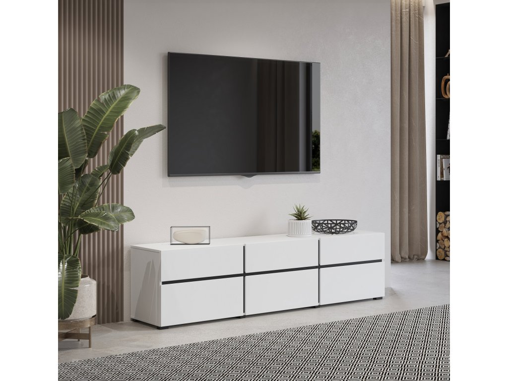 Tento moderní televizní stolek je vyroben z kvalitních LTD desek, které se snadno udržují. Disponuje třemi výklopnými přihrádkami a třemi zásuvkami.