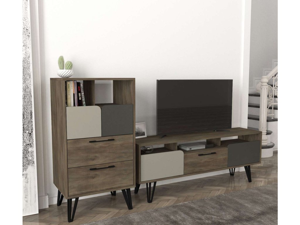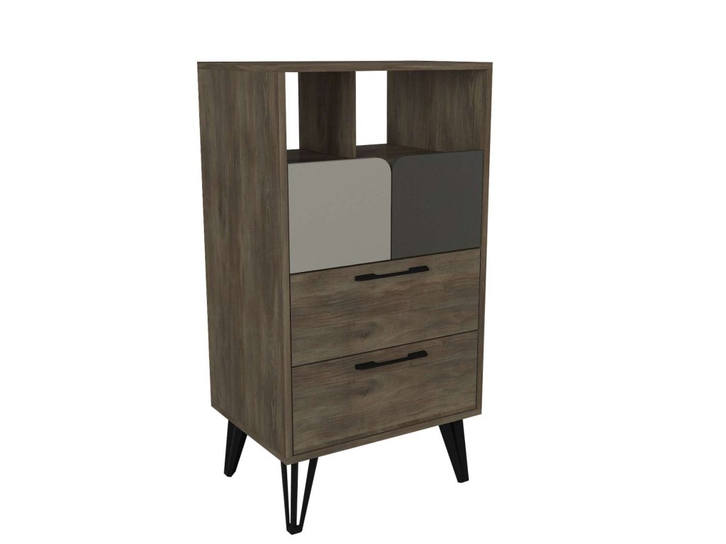 Komoda BRUGES se vyznačuje moderním provedením v elegantní kombinaci šedé, béžové a antracitové barvy, která snadno zapadne do jakéhokoliv interiéru. Vysoký vzhled komody poskytuje dostatek úložného prostoru díky dvěma zásuvkám, skříňce a regálku, což vám umožní efektivně uspořádat všechny vaše věci.