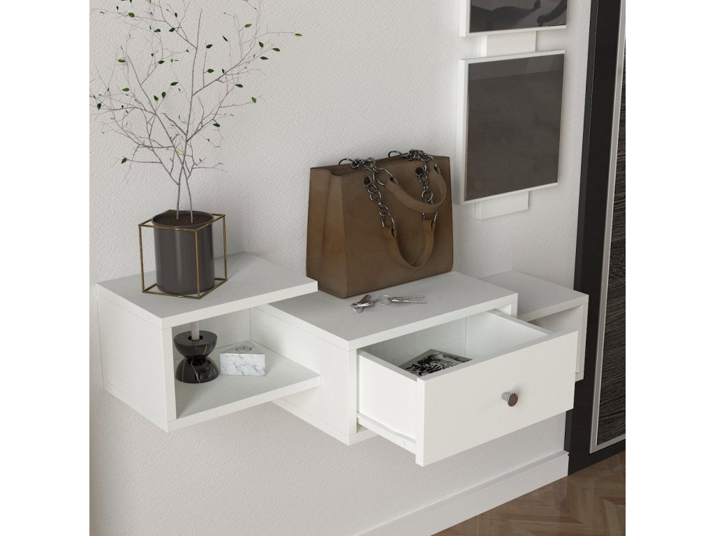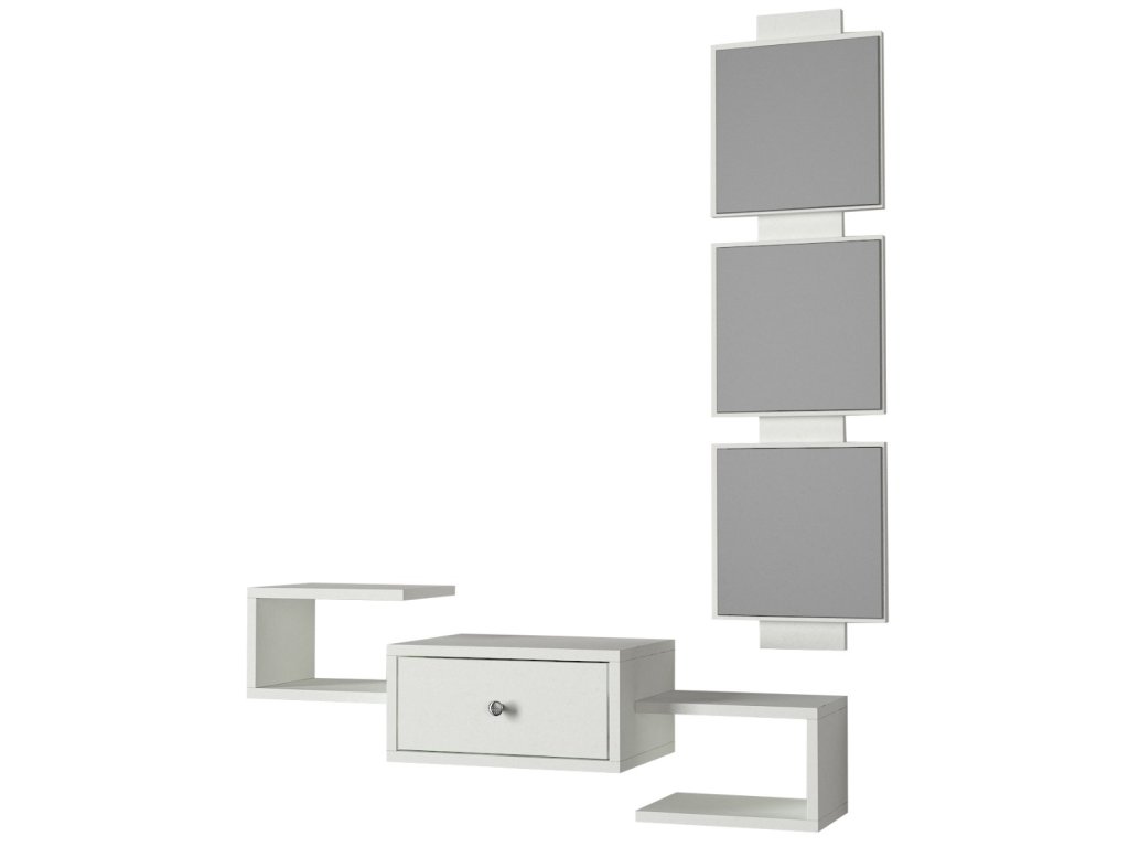 Moderní a stylová mini předsíňová sestava v minimalistickém designu zaplní prázdné místo ve Vaší předsíni a oživí každý prostor. Zrcadlo členěné do tří částí dává sestavě nevšední design. Praktická závěsná zásuvka a dvě odkládací police doplní potřebný úložný prostor na klíče či jiné drobnosti.