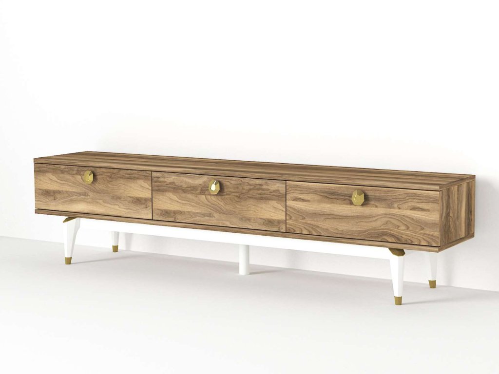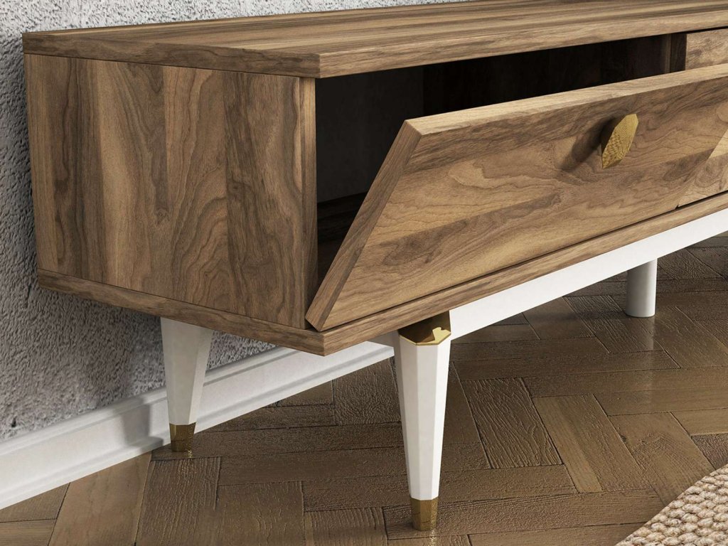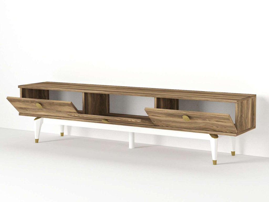TV stolek BUSED je ideální volbou pro ty, kteří hledají moderní a funkční nábytek s elegantním vzhledem. Jeho ořechová barva a minimalistický design přinášejí do vašeho domova teplo a moderní styl.