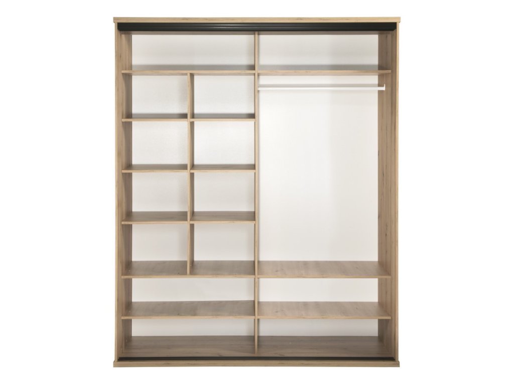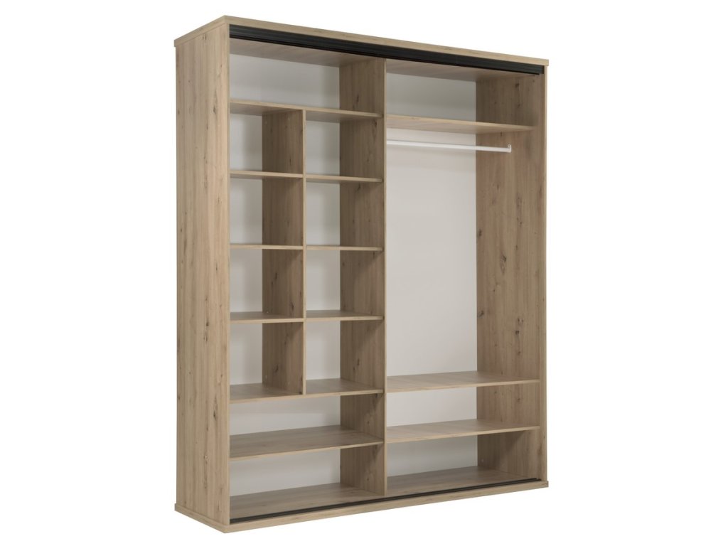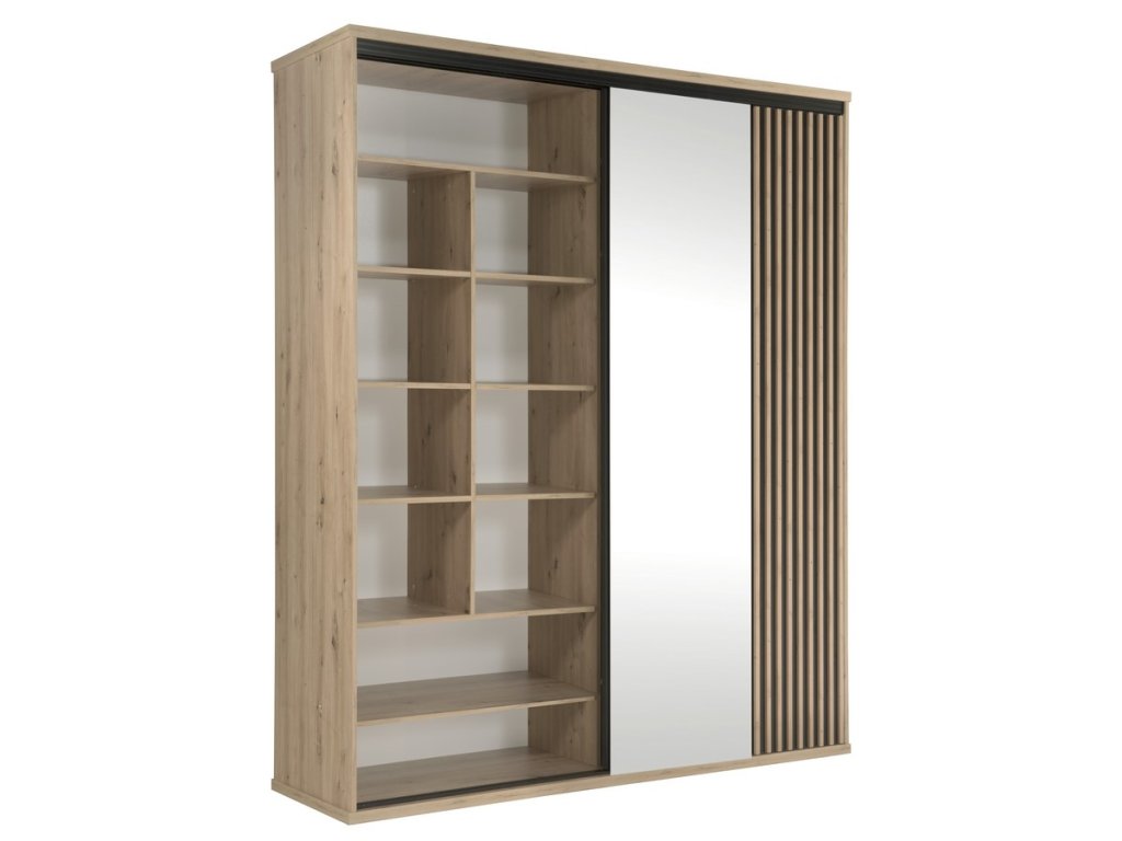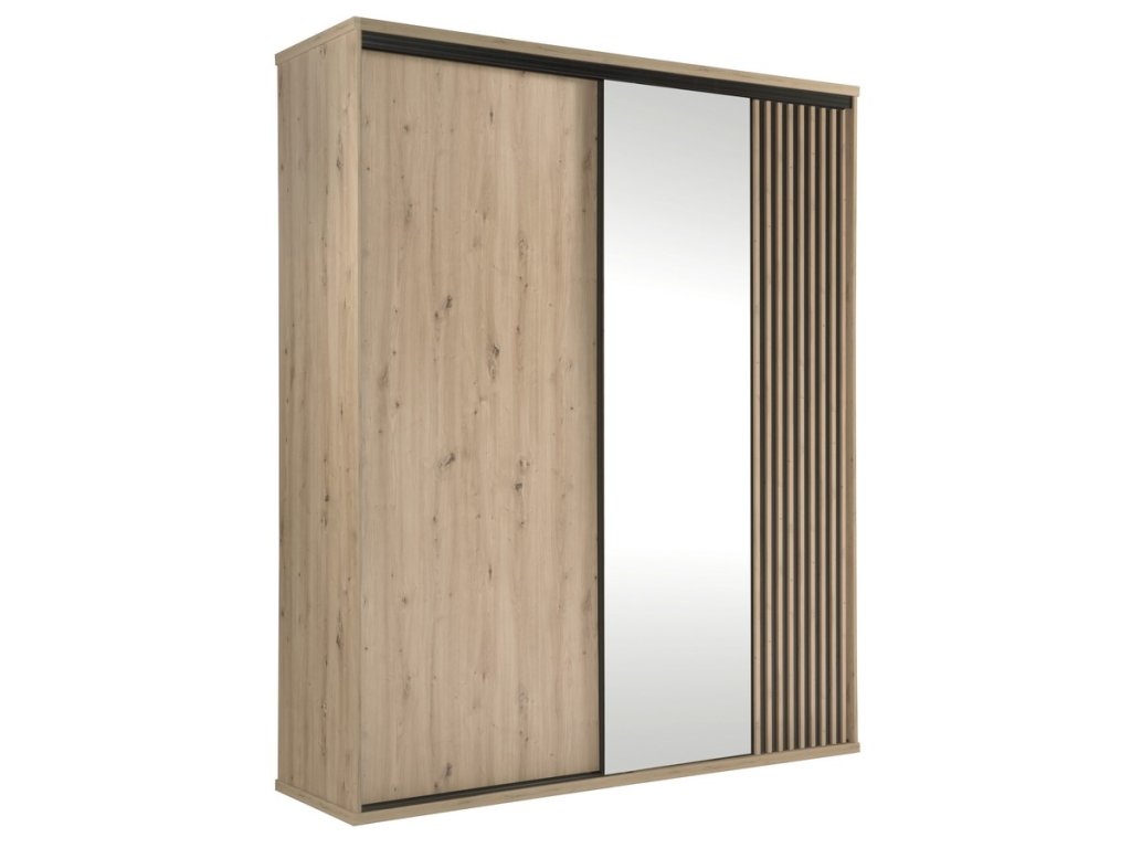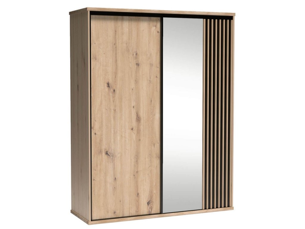 Šatní skříň s posuvnými dveřmi s netradičním provedením detailu dvířek s lamelami. Kolekce nábytku v sobě spojuje jednoduchost, originální vzhled a funkčnost. Barevné provedení je v kombinaci dub artisan/černá mat. Nábytek je vyroben z kvalitního lamina ohraničeného ABS páskou, dekorační lamely jsou vyrobeny z desky MDF. Uvnitř skříně je v pravé části šatní tyč a tři police, v levé části jsou umístěny police. Jedno křídlo posuvných dveří je doplněno zrcadlem. Kolekce se skládá z mnoha prvků a tento široký výběr Vám zaručí sestavit si nábytek podle svých vlastních představ a přání. Dodáváme v demontovaném stavu.Doplňkové parametry