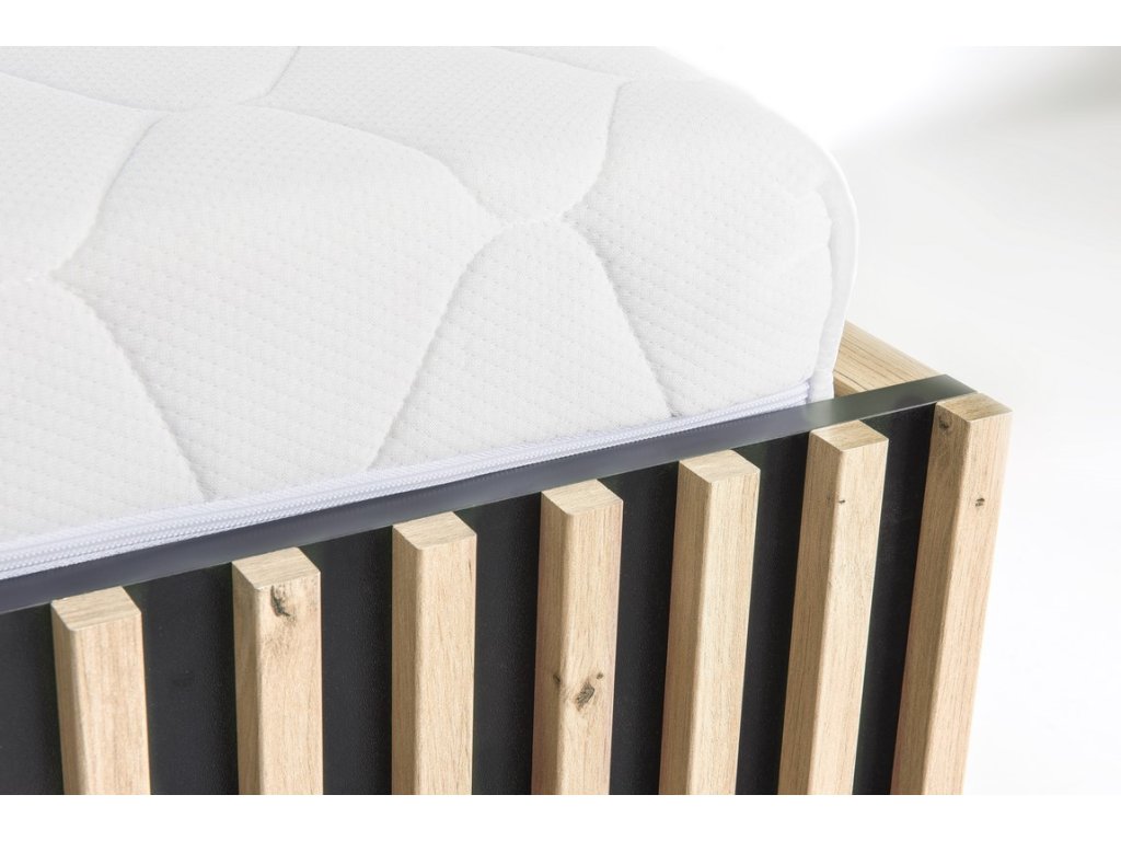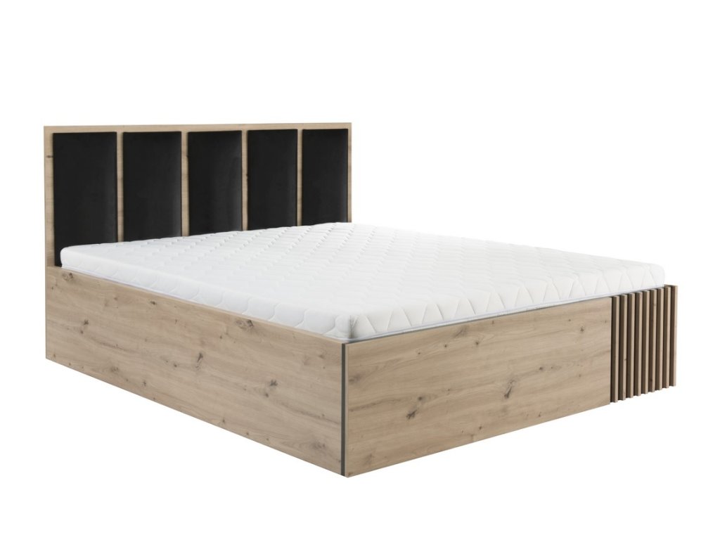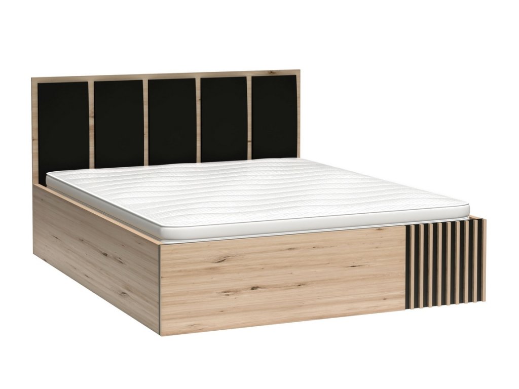 Postel 140 s úložným prostorem v moderním provedení. Kolekce nábytku v sobě spojuje jednoduchost, originální vzhled a funkčnost. Barevné provedení je v kombinaci dub artisan/černá mat. Nábytek je vyroben z kvalitního lamina ohraničeného ABS páskou, dekorační lamely jsou vyrobeny z desky MDF. Čelo postele je doplněno polstrováním. Součástí postele je lamelový zvedací rošt, díky kterému vznikne praktický úložný prostor. Cena postele je bez matrace, tu je nutno dokoupit. Doporučený rozměr matrace je 140 x 200 cm. Kolekce se skládá z mnoha prvků a tento široký výběr Vám zaručí sestavit si nábytek podle svých vlastních představ a přání. Dodáváme v demontovaném stavu.Doplňkové parametry