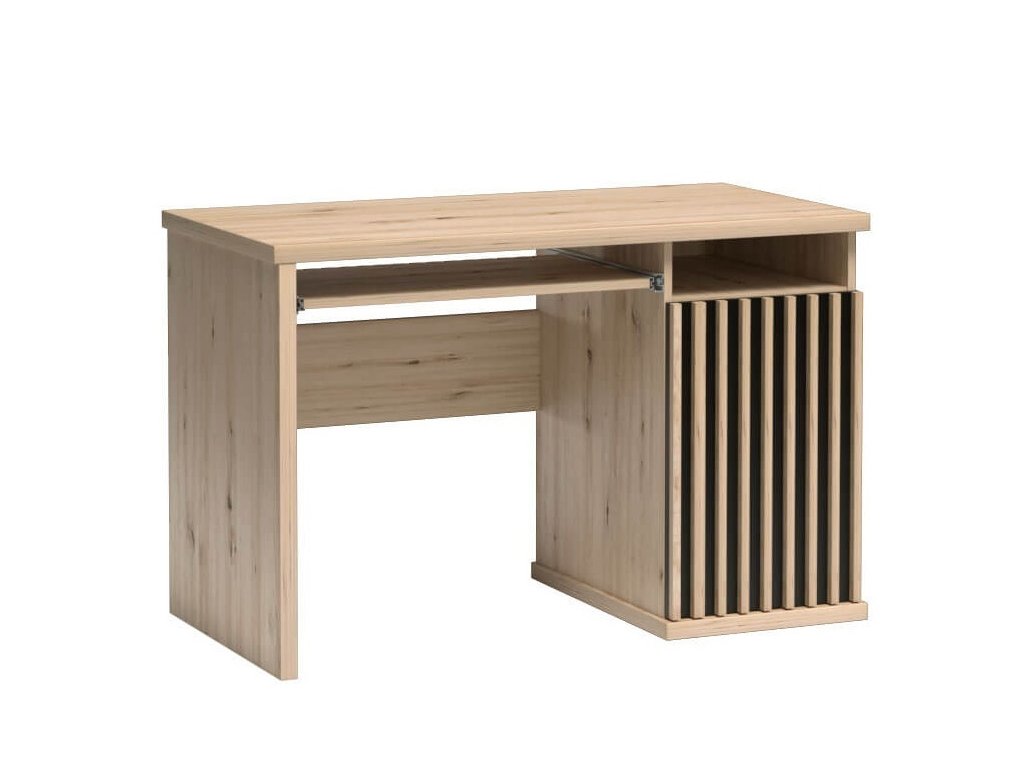 Pracovní stůl jednodveřový (s výsuvnou deskou na klávesnici) s netradičním provedením detailu dvířek s lamelami. Kolekce nábytku v sobě spojuje jednoduchost, originální vzhled a funkčnost. Barevné provedení je v kombinaci dub artisan/černá mat. Nábytek je vyroben z kvalitního lamina ohraničeného ABS páskou, dekorační lamely jsou vyrobeny z desky MDF. Zásuvka je vybavena kovovými pojezdy se systémem tichého dovírání. Kolekce se skládá z mnoha prvků a tento široký výběr Vám zaručí sestavit si nábytek podle svých vlastních představ a přání. Dodáváme v demontovaném stavu.Doplňkové parametry