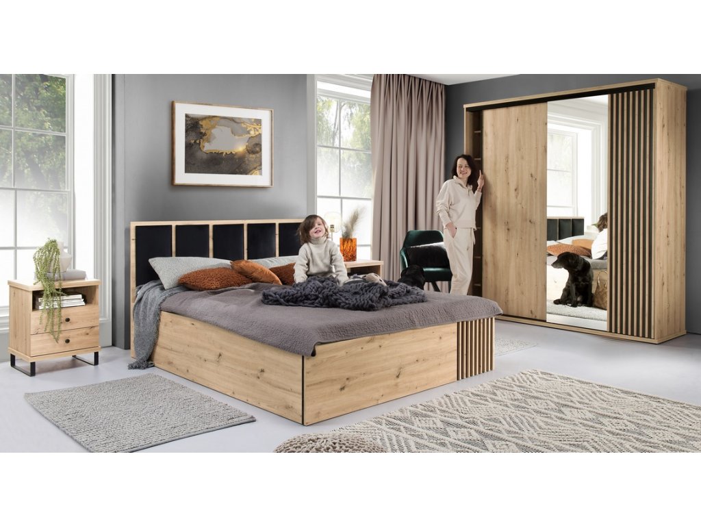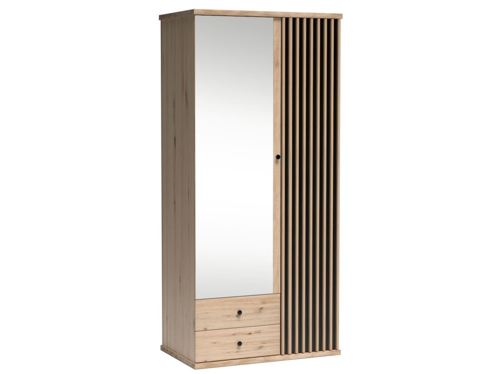 Šatni skříň dvoudeřova s netradičním provedením detailu dvířek s lamelami. Kolekce nábytku v sobě spojuje jednoduchost, originální vzhled a funkčnost. Barevné provedení je v kombinaci dub artisan/černá mat. Nábytek je vyroben z kvalitního lamina ohraničeného ABS páskou, dekorační lamely jsou vyrobeny z desky MDF. Uvnitř skříně viz obrázek, Možnost dokoupit další police. Skříň obsahuje zrcadlo. Kolekce se skládá z mnoha prvků a tento široký výběr Vám zaručí sestavit si nábytek podle svých vlastních představ a přání. Dodáváme v demontovaném stavu.