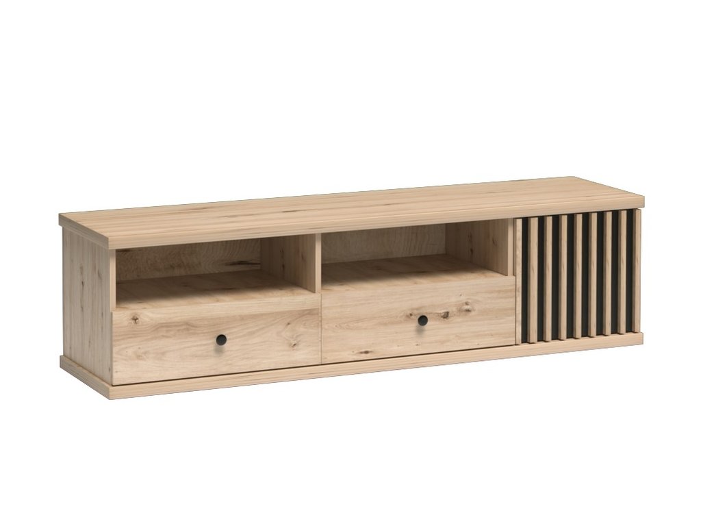 Televizní stolek jednodveřový se dvěma zásuvkami s netradičním provedením detailu dvířek s lamelami. Kolekce nábytku v sobě spojuje jednoduchost, originální vzhled a funkčnost. Barevné provedení je v kombinaci dub artisan/černá mat. Nábytek je vyroben z kvalitního lamina ohraničeného ABS páskou, dekorační lamely jsou vyrobeny z desky MDF. Zásuvky jsou vybaveny kovovými pojezdy se systémem tichého dovírání. Stolek je doplněn kovovými nohami v černé barvě. Kolekce se skládá z mnoha prvků a tento široký výběr Vám zaručí sestavit si nábytek podle svých vlastních představ a přání. Dodáváme v demontovaném stavu.Doplňkové parametry