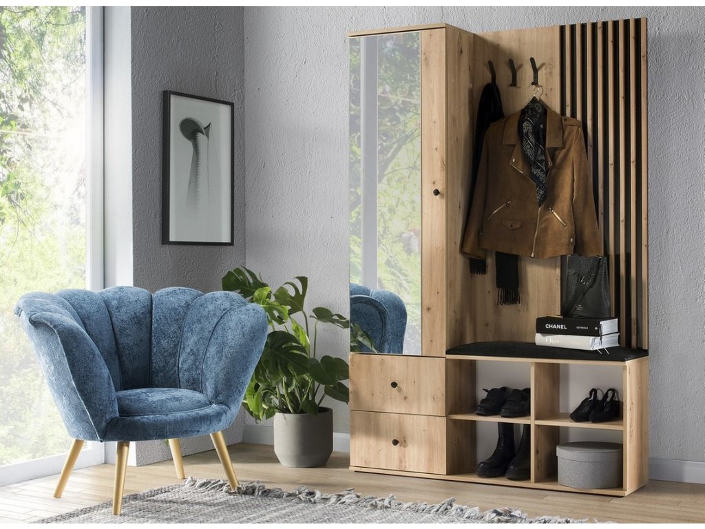 Sestava do předsíně s netradičním provedením detailu dvířek s lamelami. Kolekce nábytku v sobě spojuje jednoduchost, originální vzhled a funkčnost. Barevné provedení je v kombinaci dub artisan/černá mat. Nábytek je vyroben z kvalitního lamina ohraničeného ABS páskou, dekorační lamely jsou vyrobeny z desky MDF. Sestava se skládá z otevřeného botníku (nosnost 56-60 kg), věšákového panelu a šatní skříně se dvěma zásuvkami. Uvnitř skříně je police s výsuvným závěsem na ramínka, dveře jsou z přední strany doplněny zrcadlem. Kolekce se skládá z mnoha prvků a tento široký výběr Vám zaručí sestavit si nábytek podle svých vlastních představ a přání. Dodáváme v demontovaném stavu.Doplňkové parametry